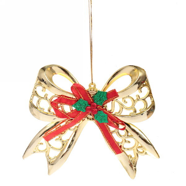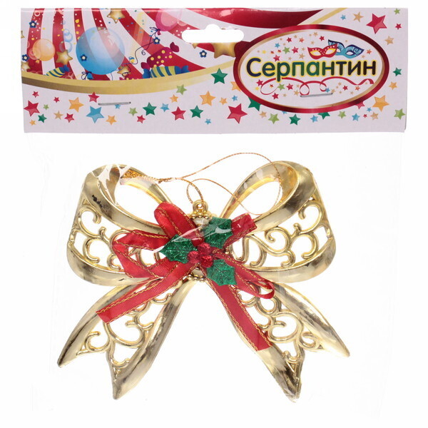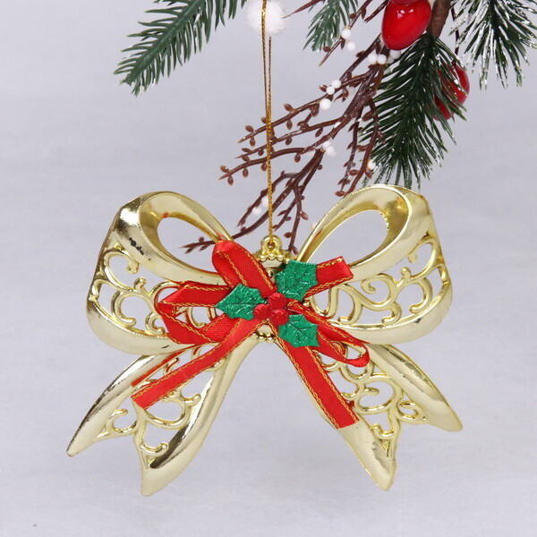 Это изыскательное украшение станет ярким акцентом в вашем праздничном декоре. Его золотистый цвет и ажурный дизайн придают ему легкость и изящество, а красная лента с зелеными листьями добавляет нотку свежести и радости. Подвесное украшение идеально подходит для украшения новогодней елки или оформления подарков, создавая атмосферу уюта и праздника.