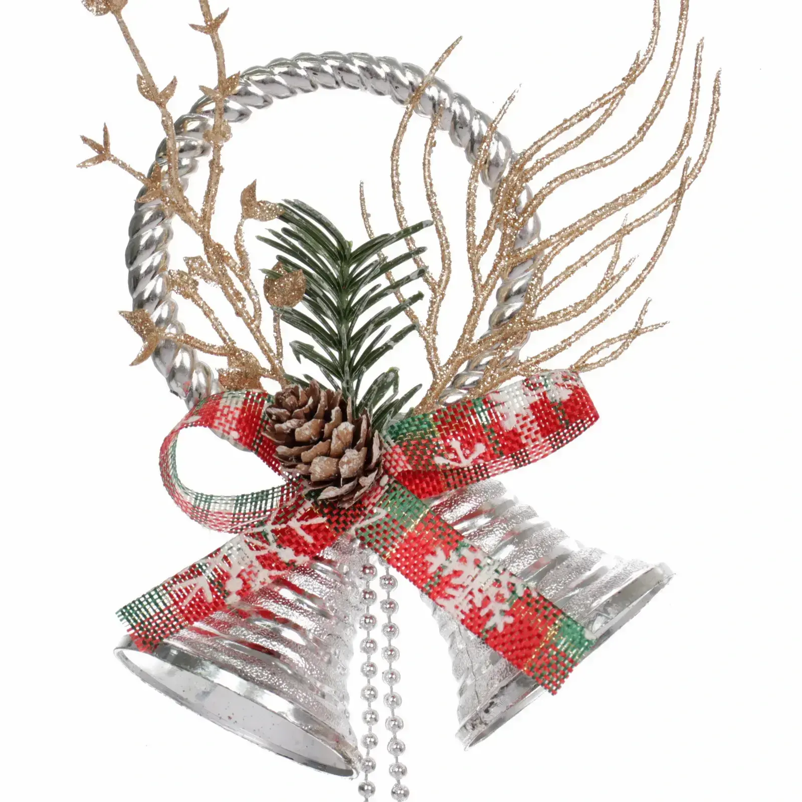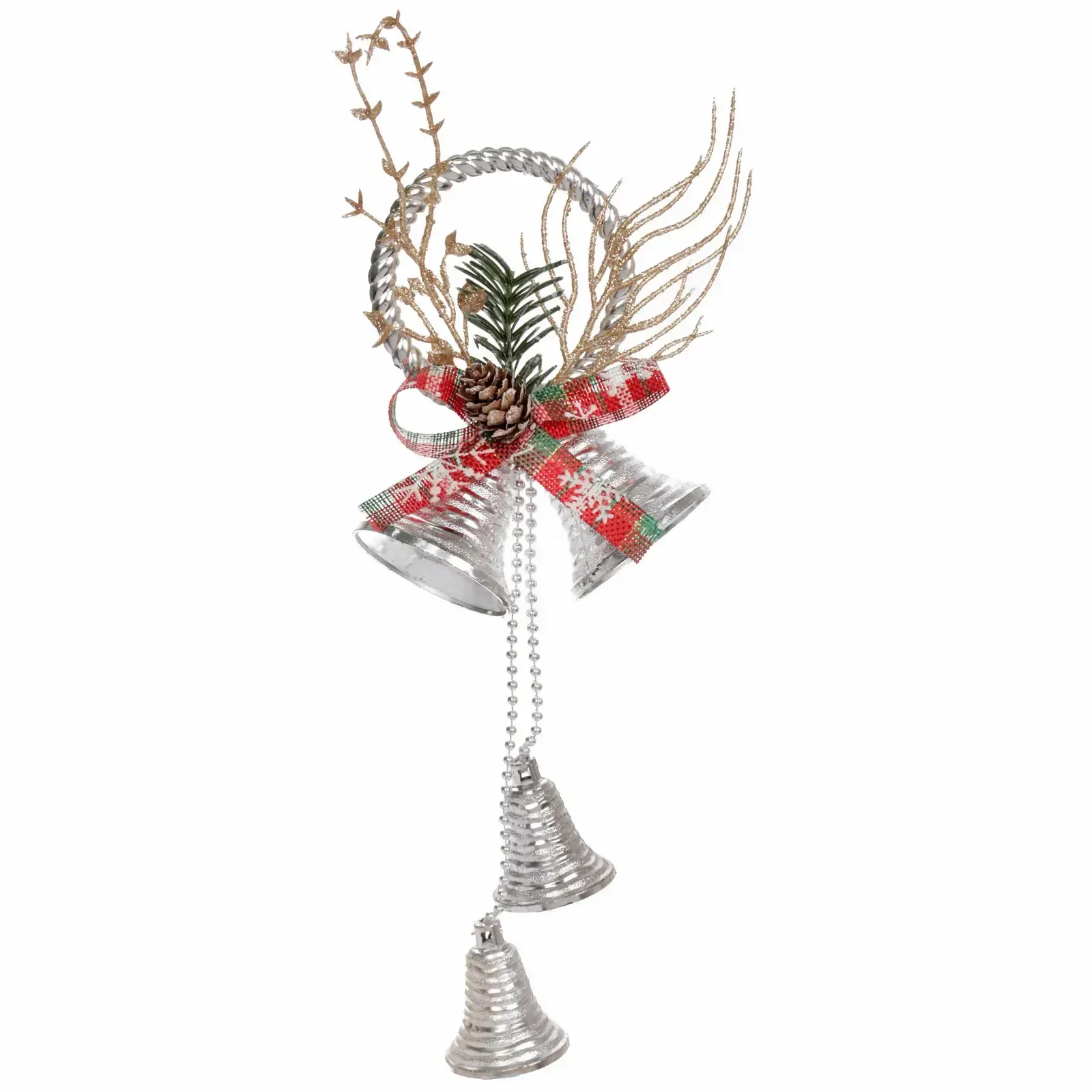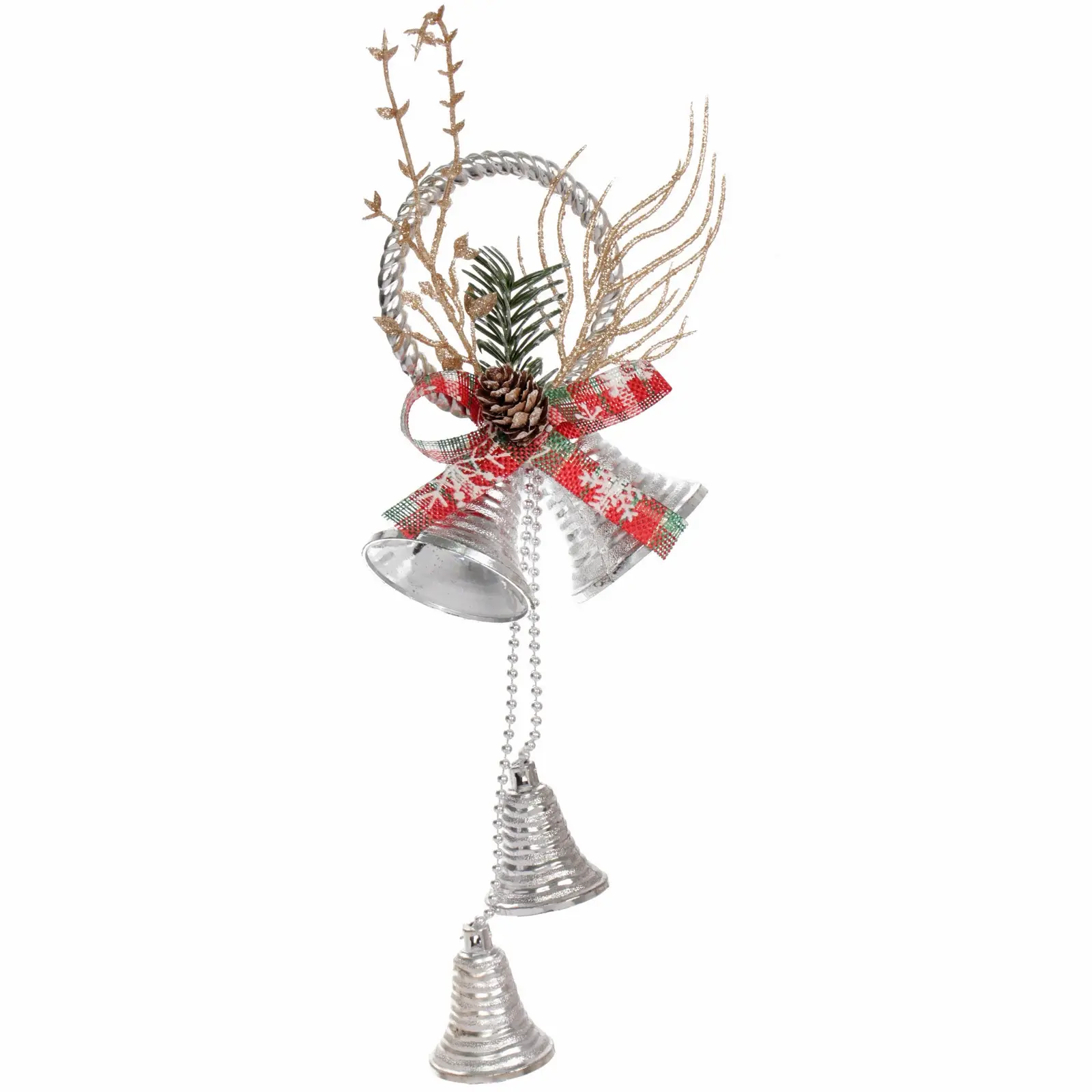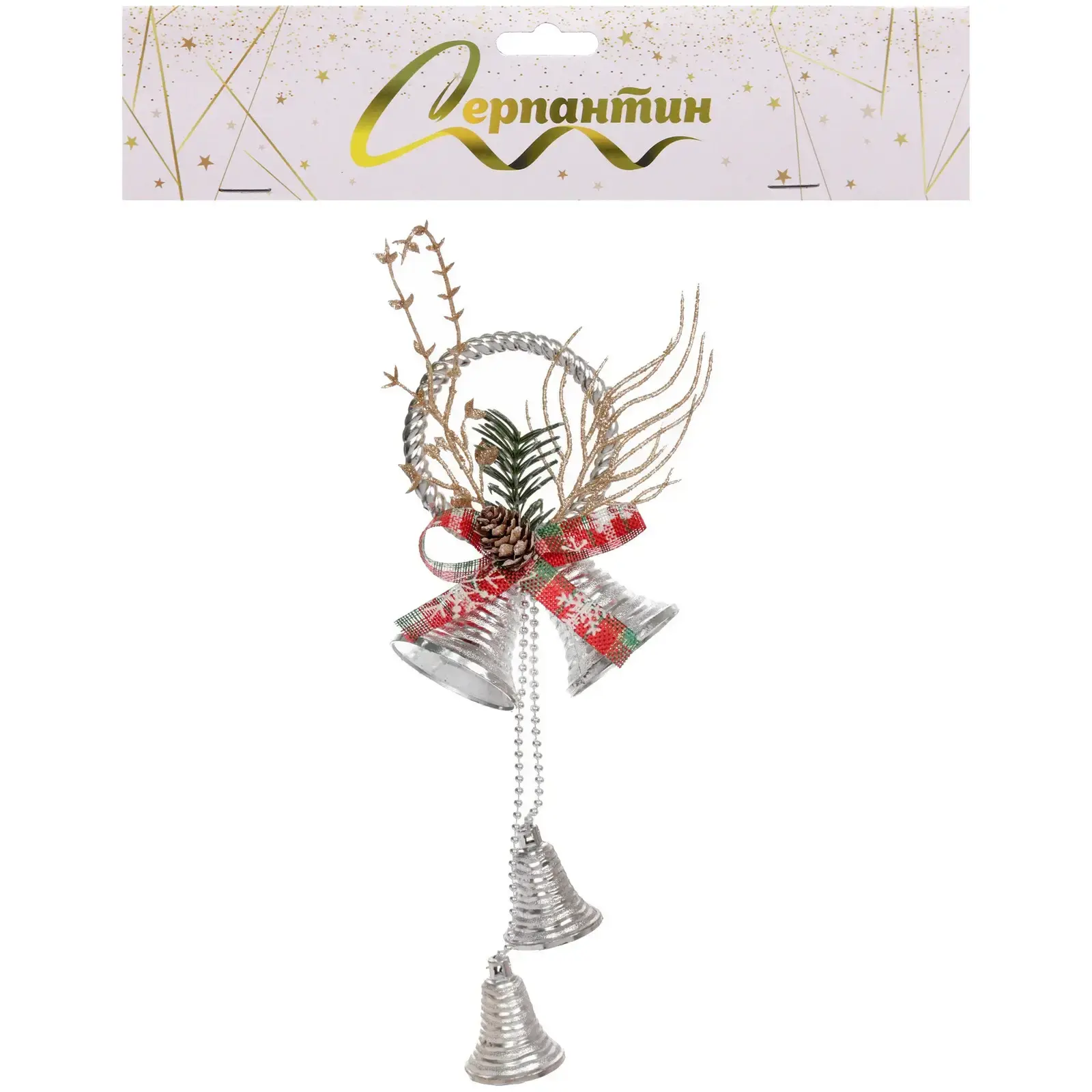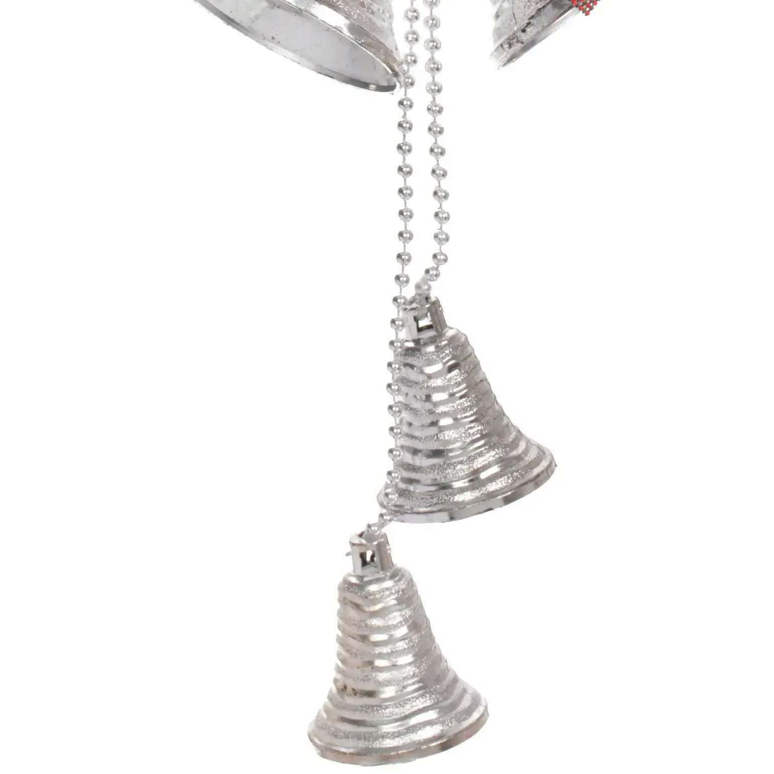 Это украшение выполнено из качественного пластика, что обеспечивает его долговечность и устойчивость к повреждениям. Серебристый цвет колокольчиков придаёт им элегантный вид, а декоративные элементы, такие как красная лента и зелёные веточки, добавляют яркие акценты. Благодаря своему размеру 12х30 см, оно легко впишется в любой интерьер, не занимая много места.