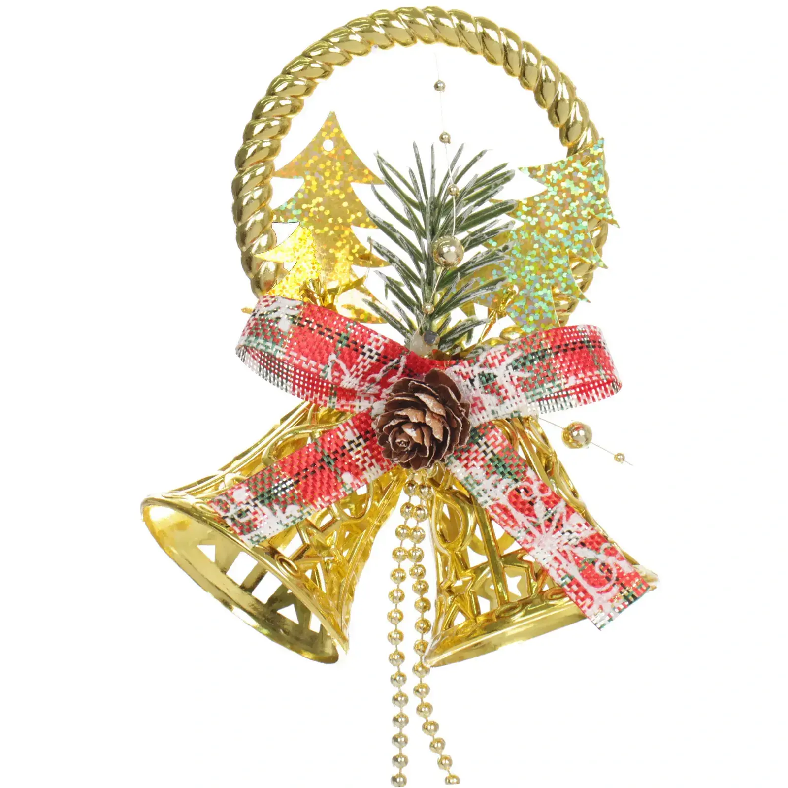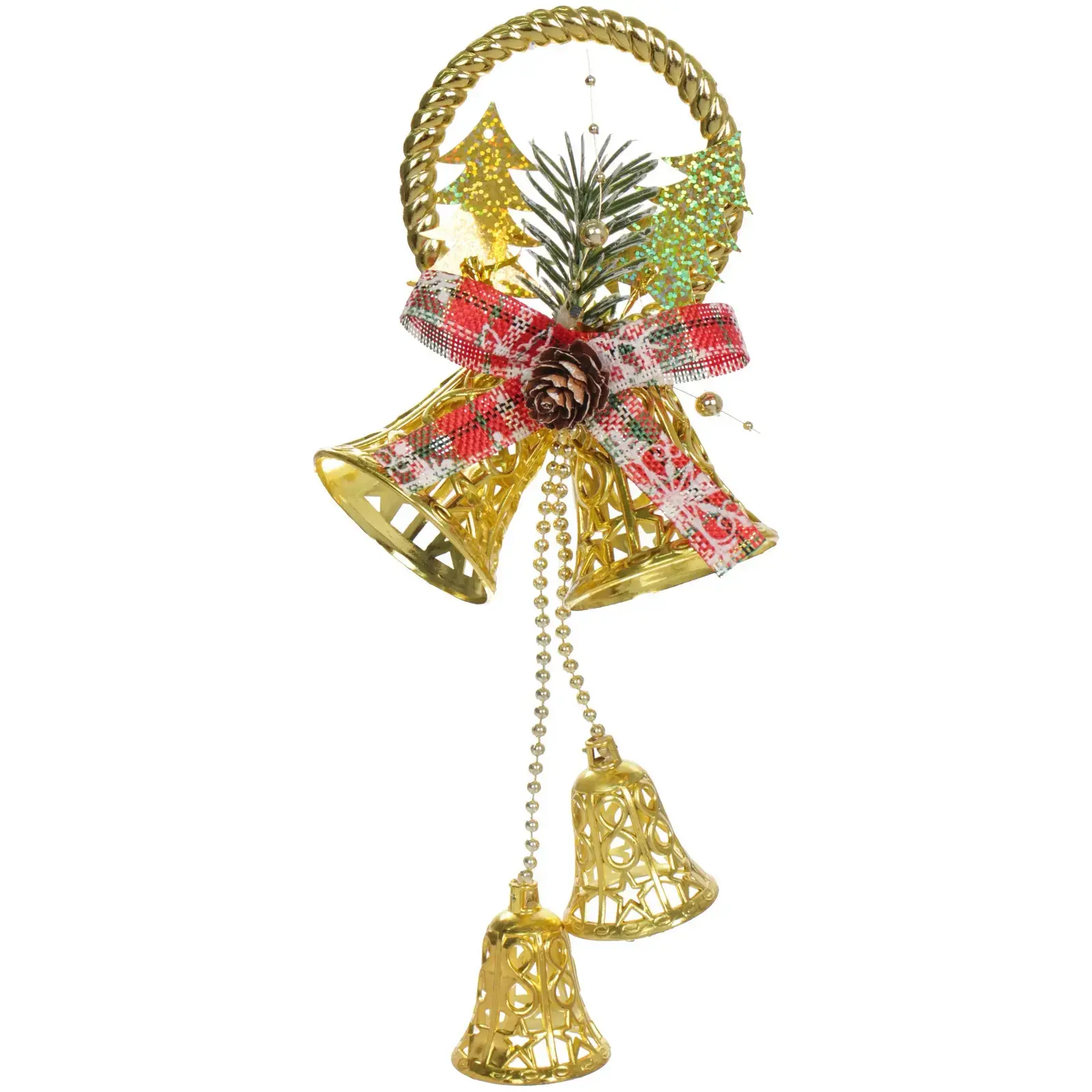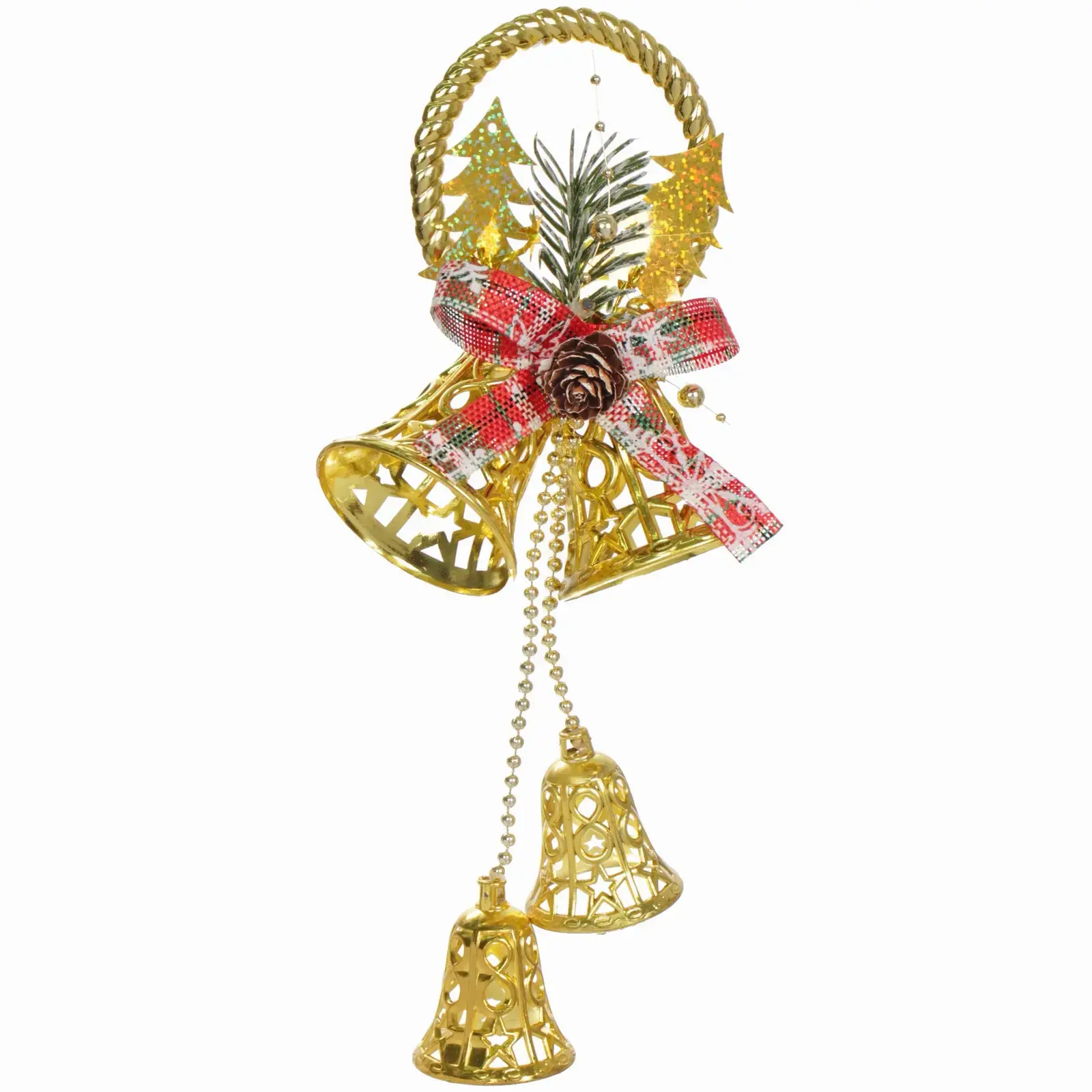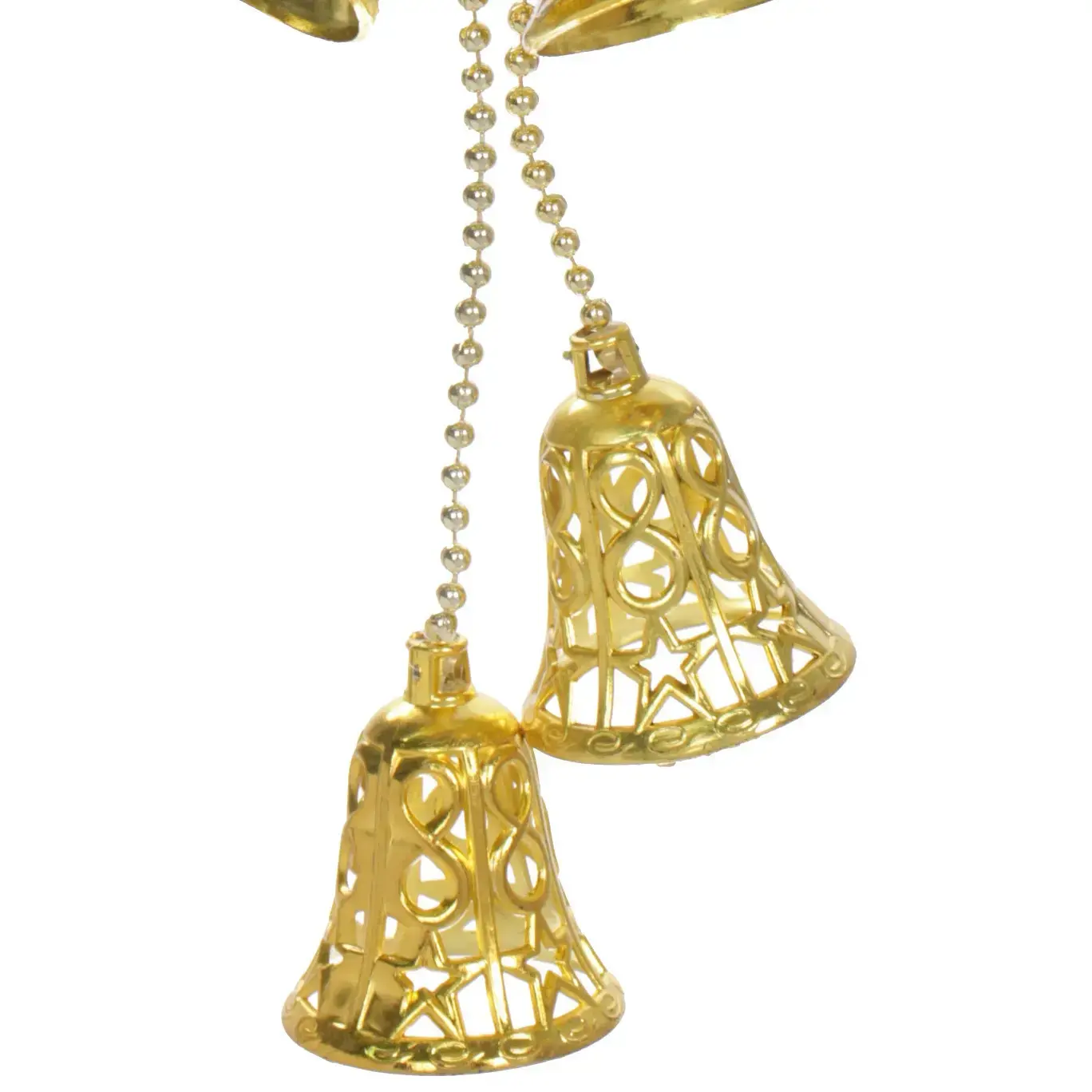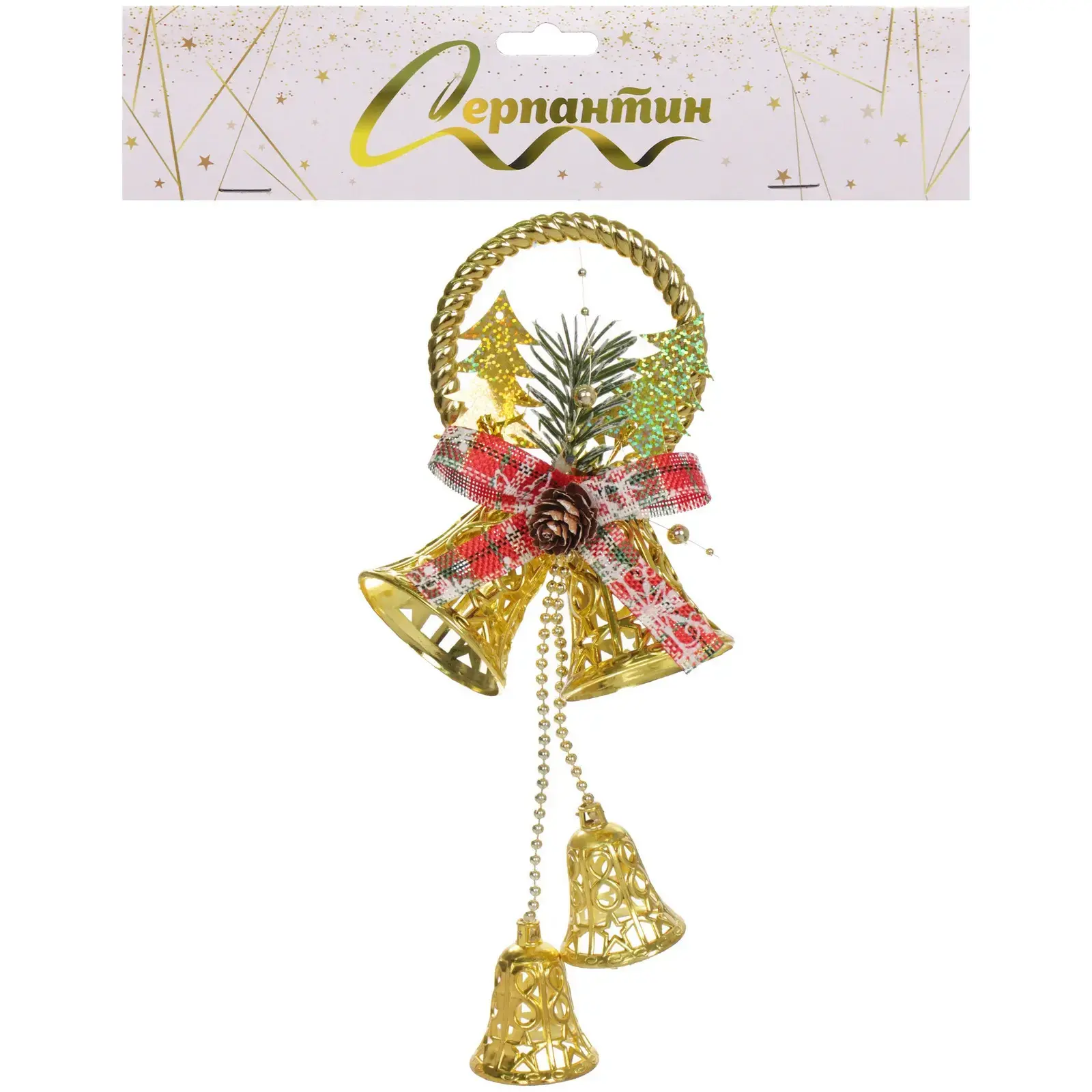 Это украшение не только красиво, но и практично. Оно выполнено из качественного пластика, что обеспечивает долговечность и устойчивость к повреждениям. Золотой цвет колокольчиков придаёт им элегантный вид, а блестящая поверхность добавляет праздничного блеска. Красная лента с узором и элементы декора в виде шишек и зелёных веточек делают композицию завершенной и стильной.