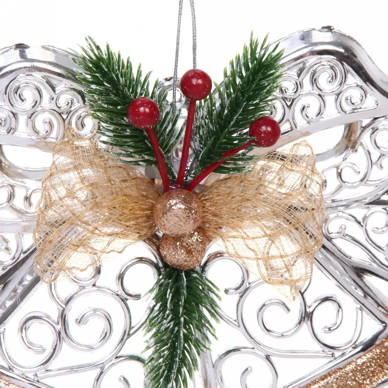 • Продуманный дизайн – сочетание свечения серебряных и шампанских оттенков, золотой ленты, зелёных веточек и красных ягод создаёт объёмный, живой образ.
