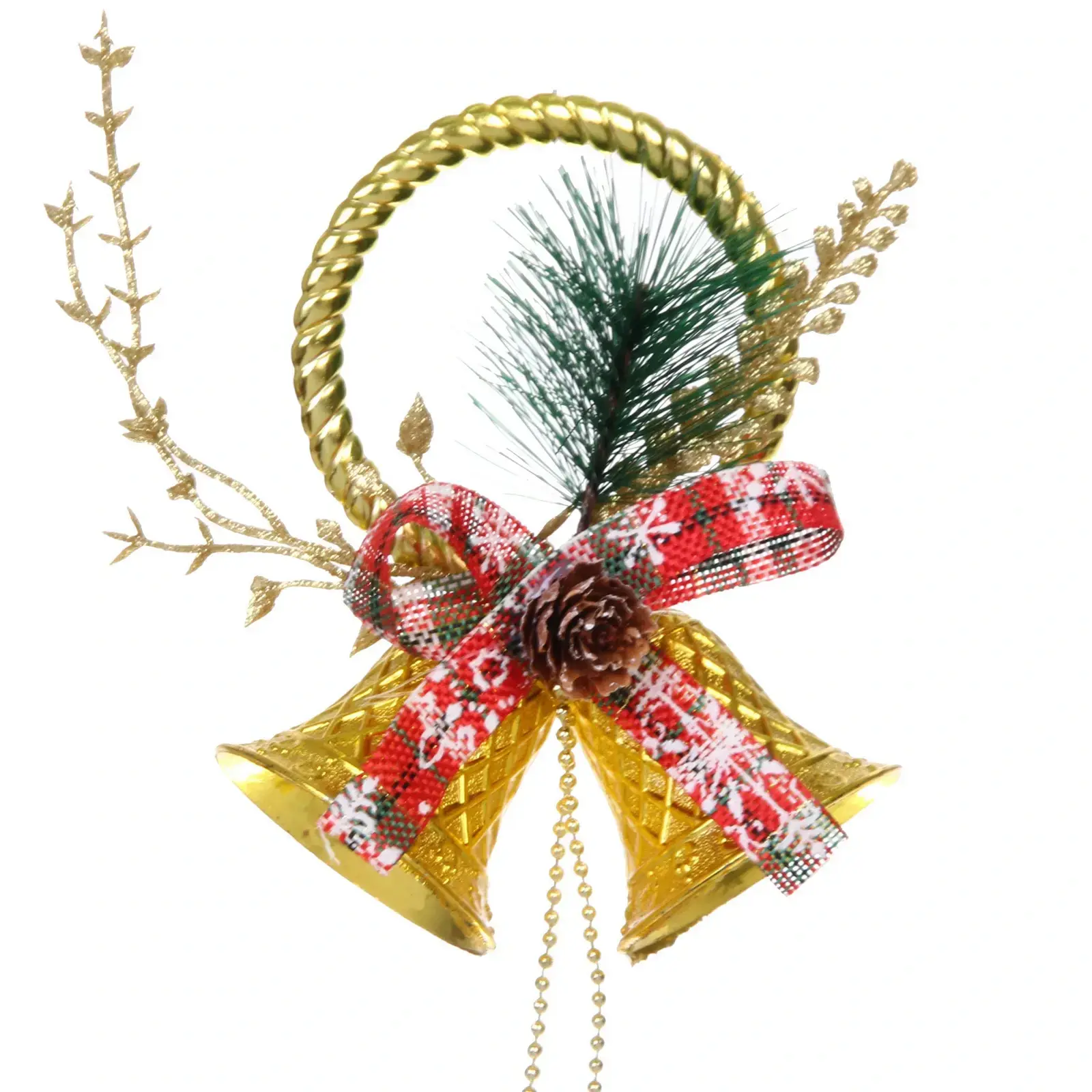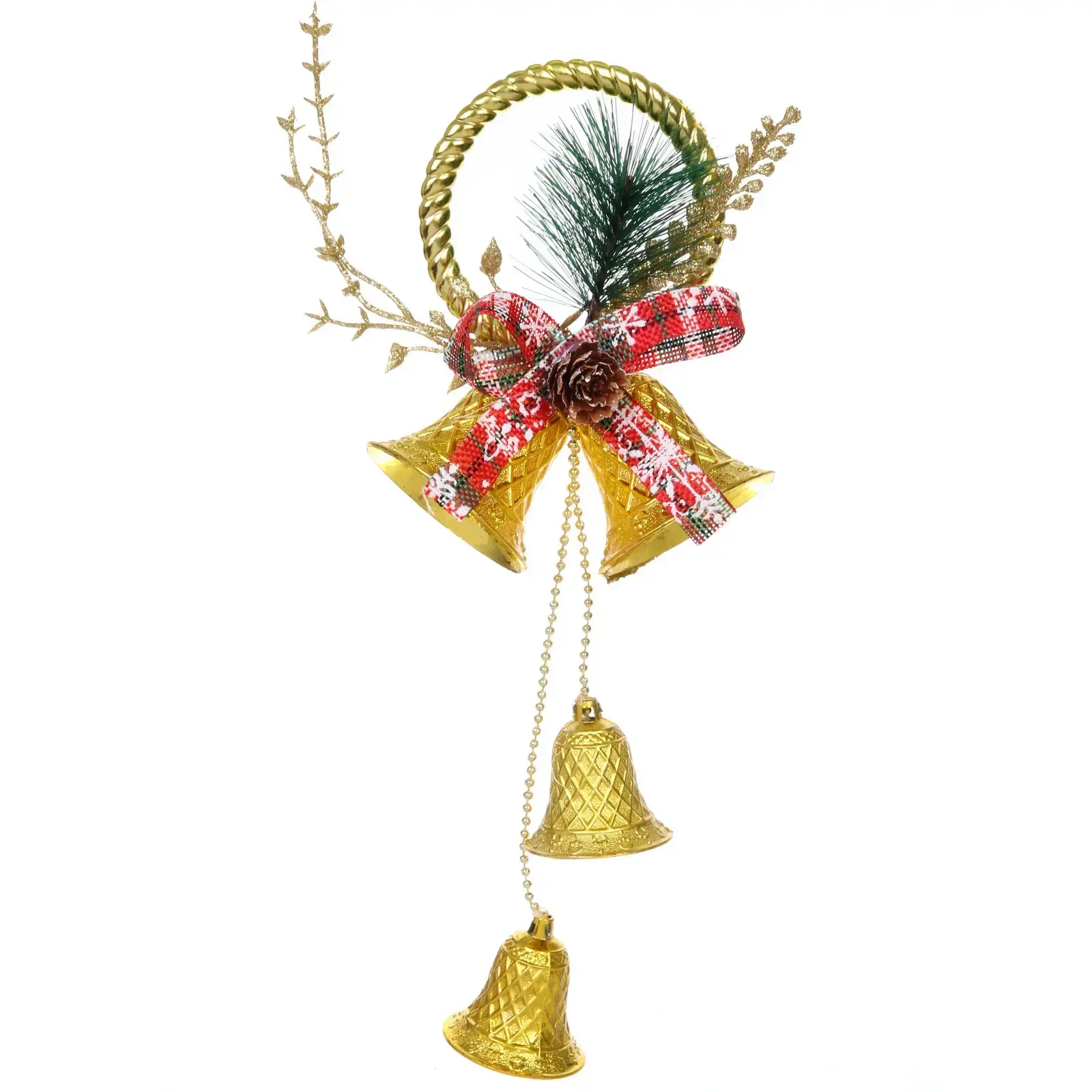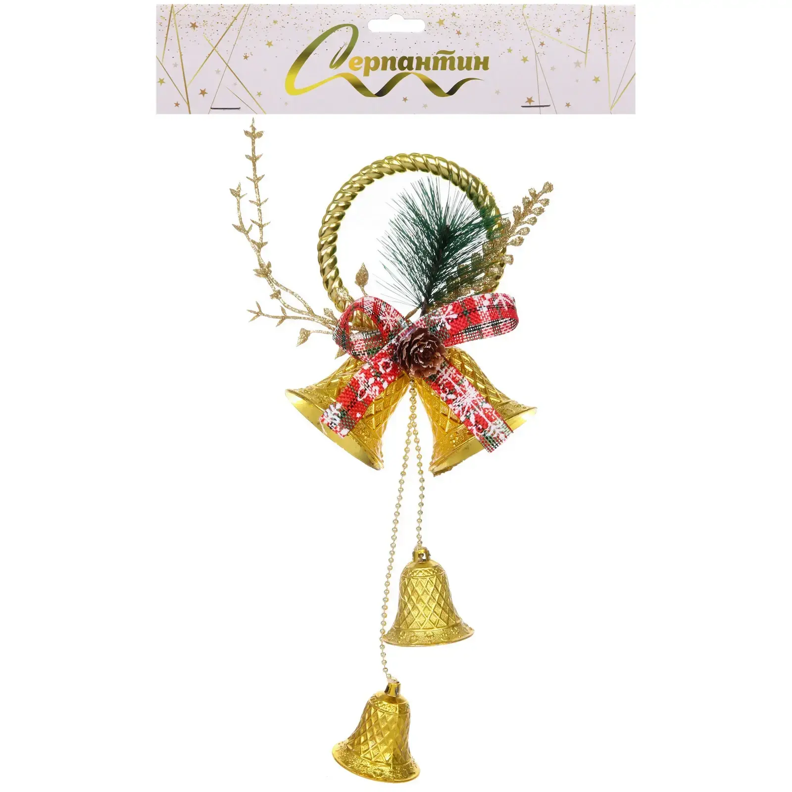 Это украшение выполнено из качественного пластика, что обеспечивает его долговечность и устойчивость к повреждениям. Золотой цвет колокольчиков придаёт им элегантный вид, а декоративные элементы, такие как красная лента и искусственные веточки, добавляют изысканности. Композиция выглядит стильно и привлекательно, что делает её отличным выбором для создания праздничного настроения.