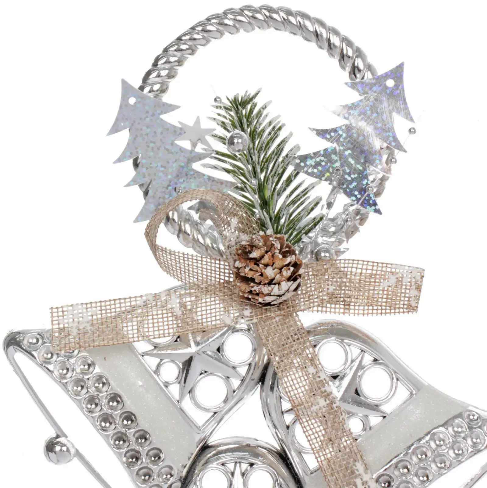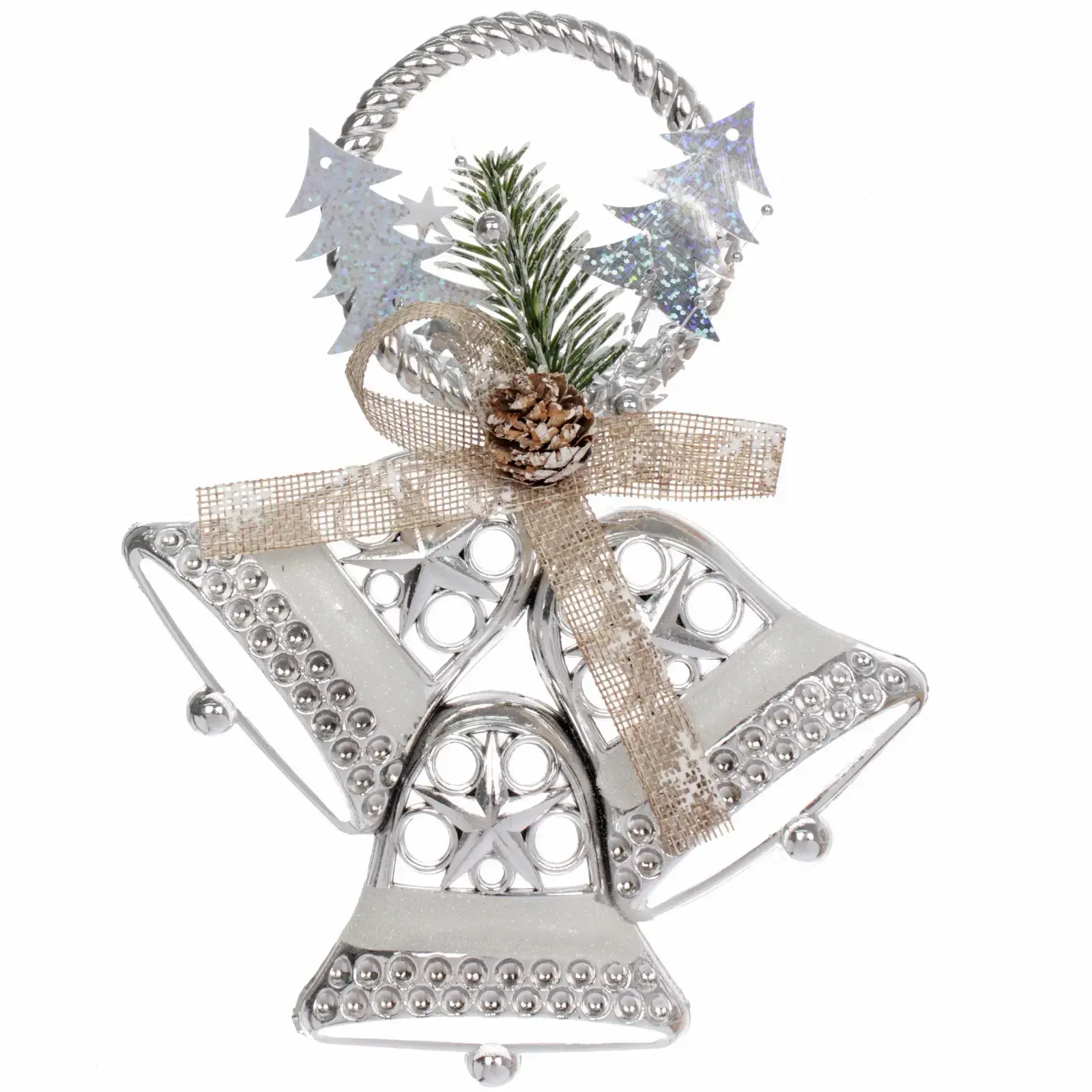 Размеры украшения составляют 18х23 см, что делает его заметным, но не слишком громоздким. Оно выполнено из прочного пластика, что гарантирует его долговечность и устойчивость к повреждениям. Серебристый цвет и блестящая отделка придают ему праздничный вид, а декоративные элементы, такие как искусственная еловая ветка и шишка, добавляют натуральности и уюта.
