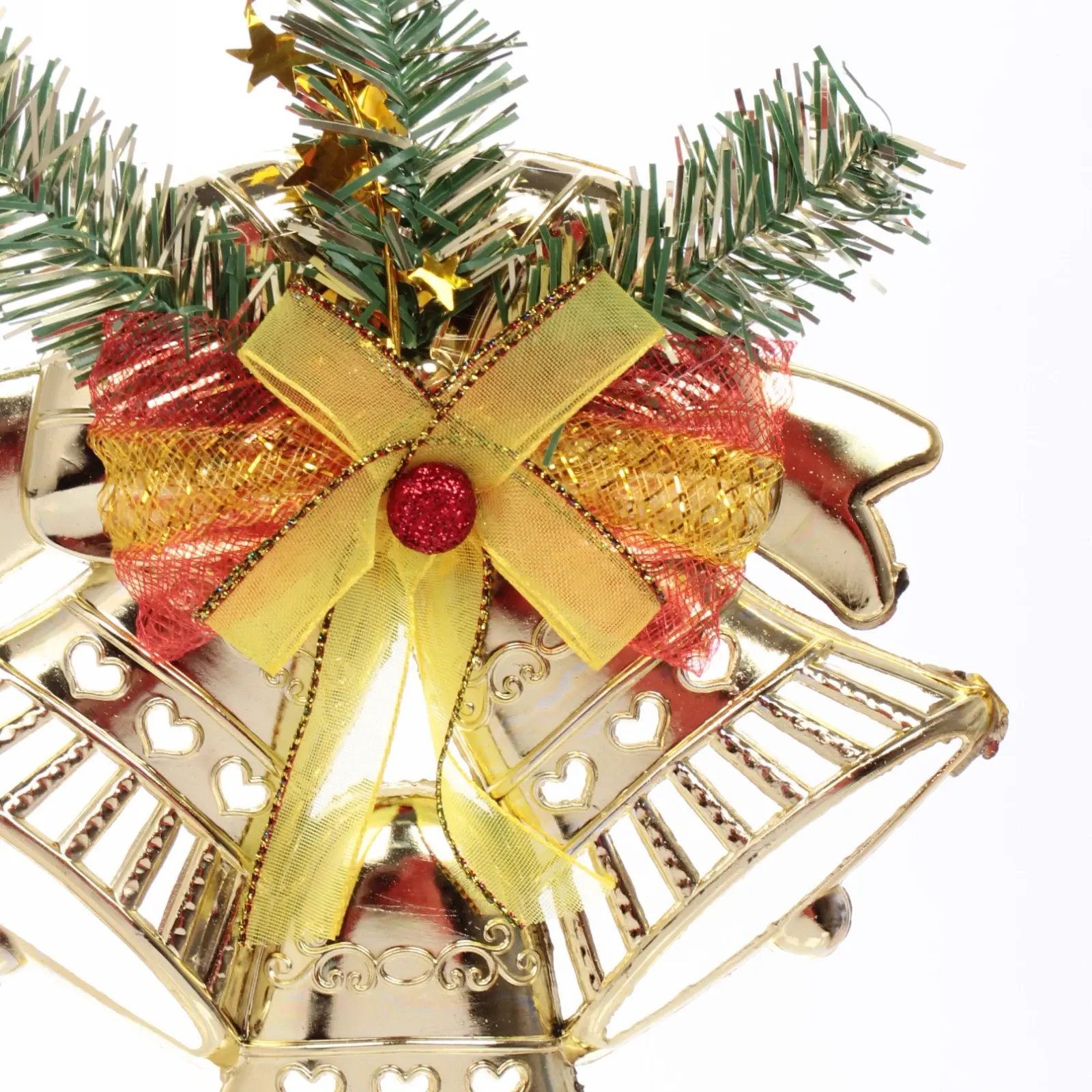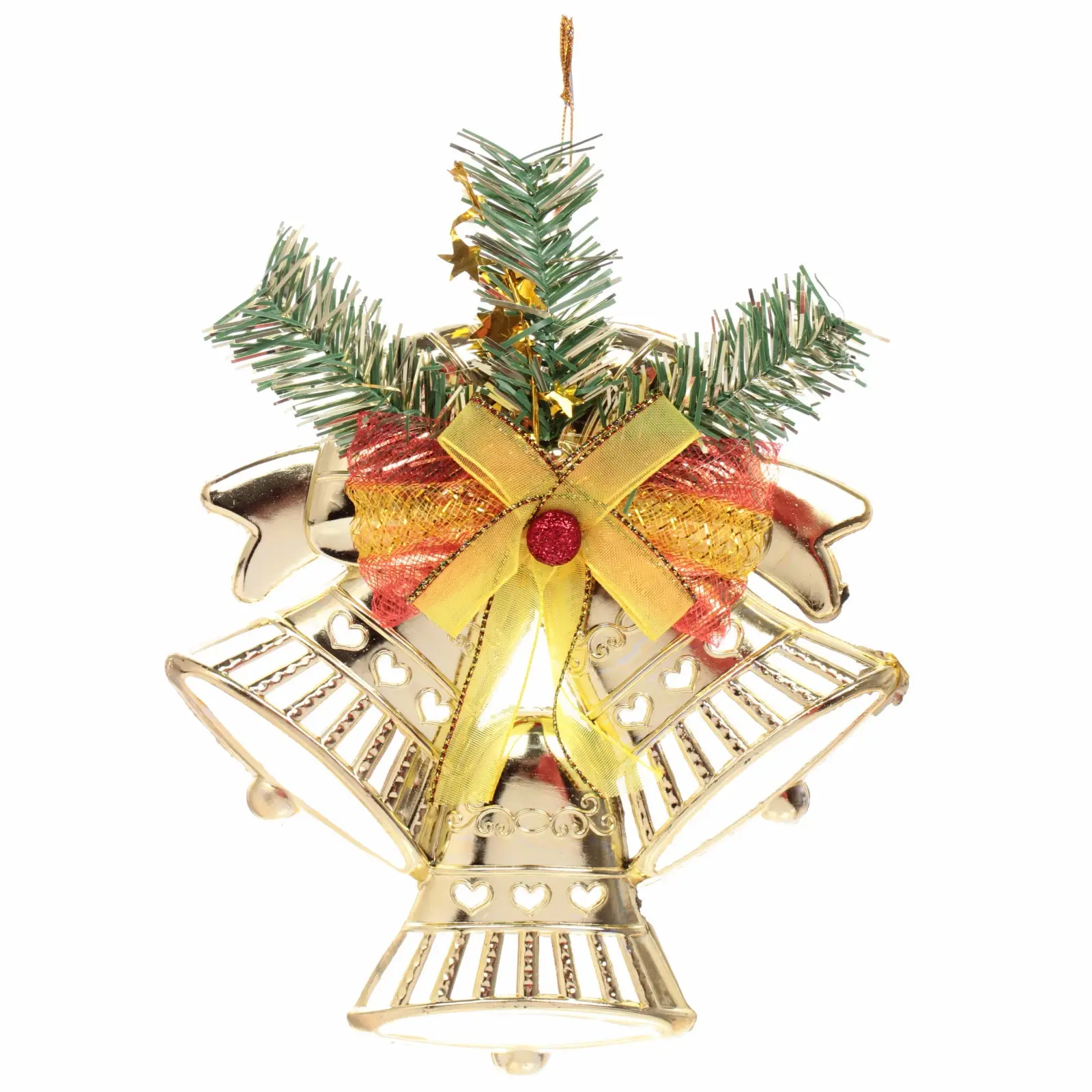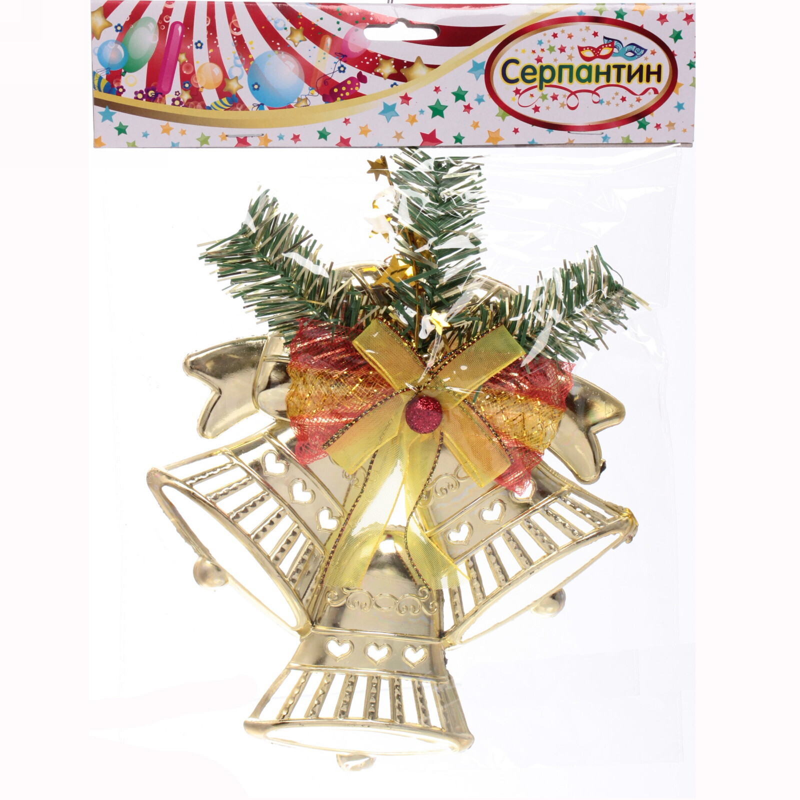 Размеры украшения составляют 17,5х20 см, что делает его заметным, но не слишком громоздким. Золотистый цвет колокольчиков и яркие акценты в виде красного банта и зелёных веточек создают гармоничное сочетание, которое будет радовать глаз. Это украшение станет отличным выбором для тех, кто ценит качество и стиль в новогоднем декоре.