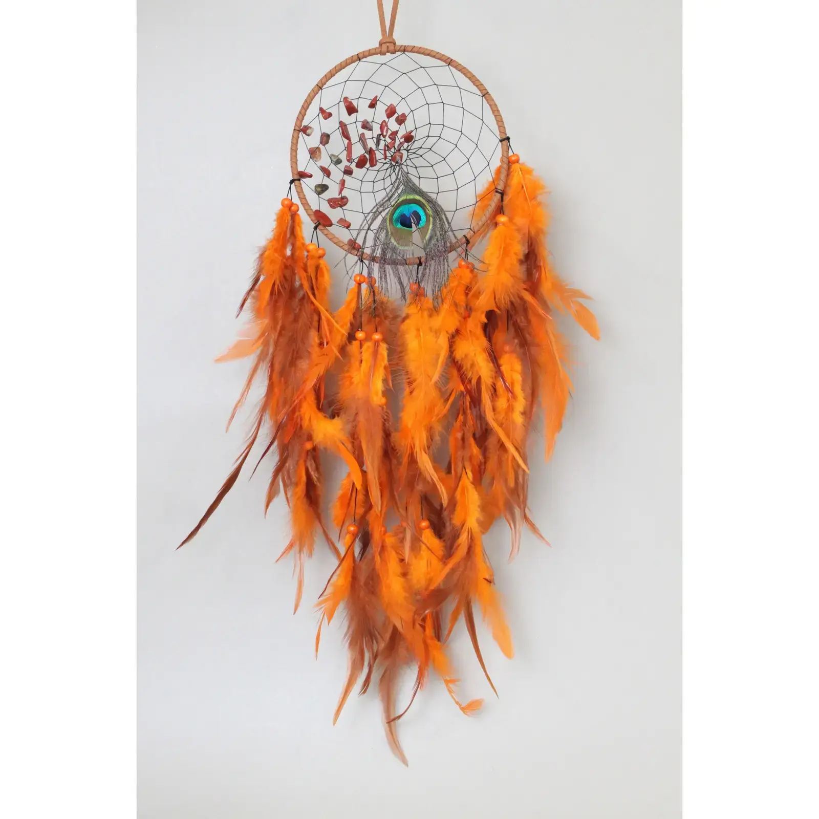 Модель выполнена в вертикальном подвесном формате с круглым ободом, обтянутым материалом тёплого коричневого оттенка. Сетка из тонкой нити украшена яркими оранжевыми бусинами и небольшими камнями нюансов закатного солнца. Главный акцент — павлинье перо с переливами зелёно-синего «глазка» в центре. Нижняя часть декорирована пушистыми оранжевыми перьями, создающими эффект движения и лёгкости.