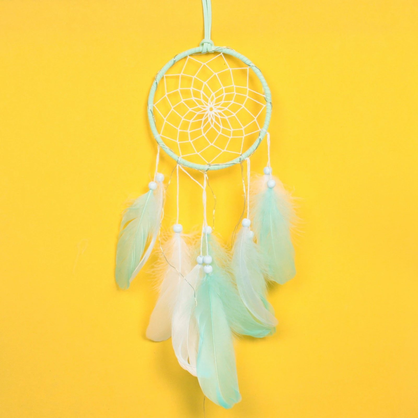Размеры ловца снов составляют 13 см в диаметре и 50 см в высоту, что делает его заметным элементом интерьера. Нежно-зеленый цвет и легкие перья придают изделию воздушность и элегантность. Этот амулет станет отличным подарком для близких, желающих создать гармонию в своем пространстве.