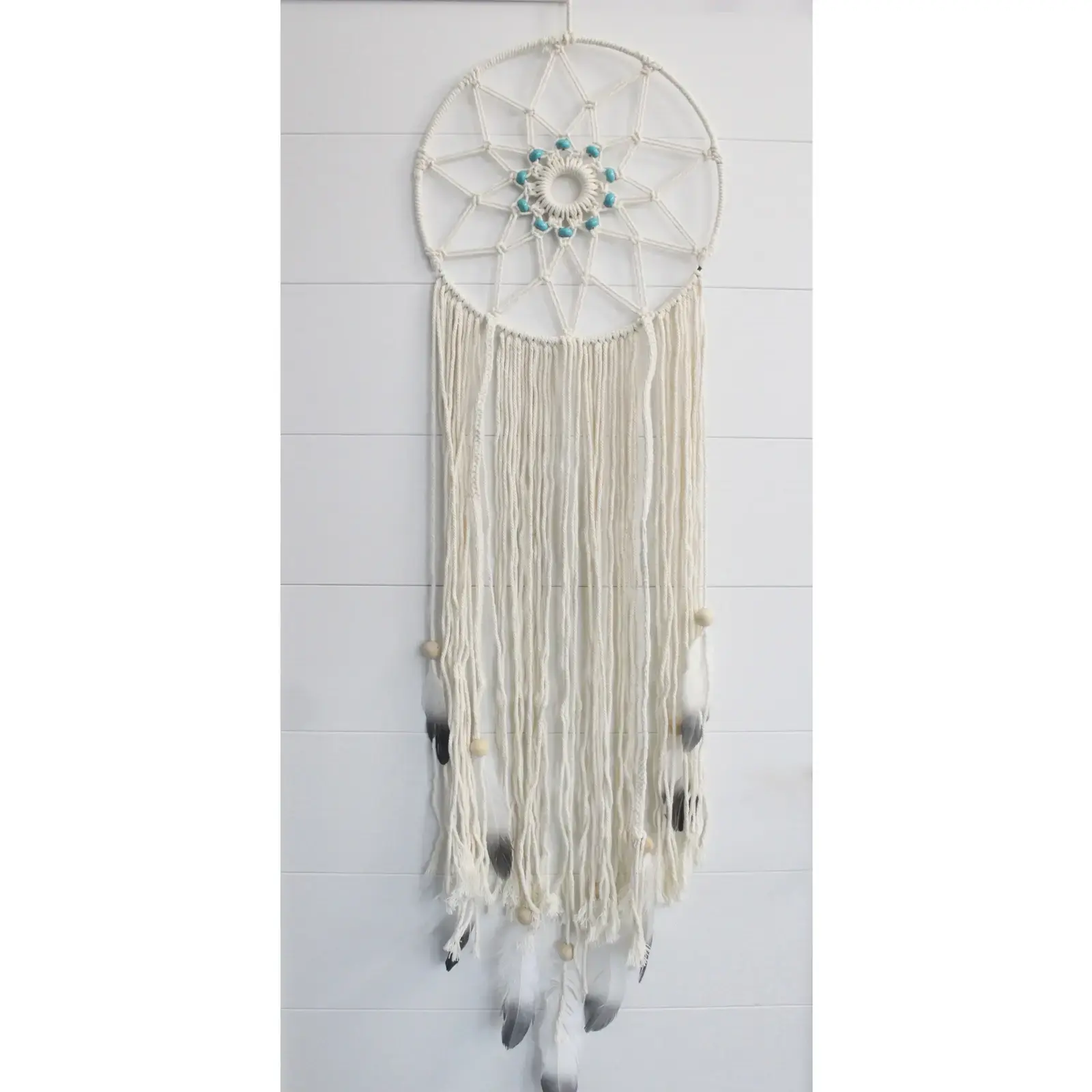 Круглая верхняя часть выполнена в виде прочного шнура с натянутыми нитями, образующими изящную «паутину» с вплетёнными бирюзовыми бусинами. От нижнего края свисают длинные светлые нити, украшенные декоративными помпонами и мягкими перьями белого цвета с серыми и чёрными кончиками. Такой контраст придаёт ловцу снов стильный и современный вид, гармонирующий с любым интерьером.