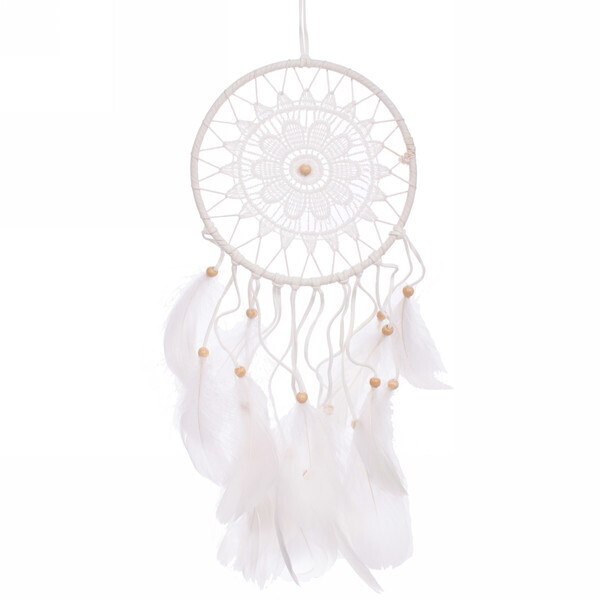 Размеры ловца снов составляют 16 см в диаметре и 55 см в длину. Основной цвет — белый, что придаёт ему легкость и воздушность. Декорирован белыми перьями и деревянными бусинами, он станет не только защитником, но и стильным элементом вашего интерьера.
