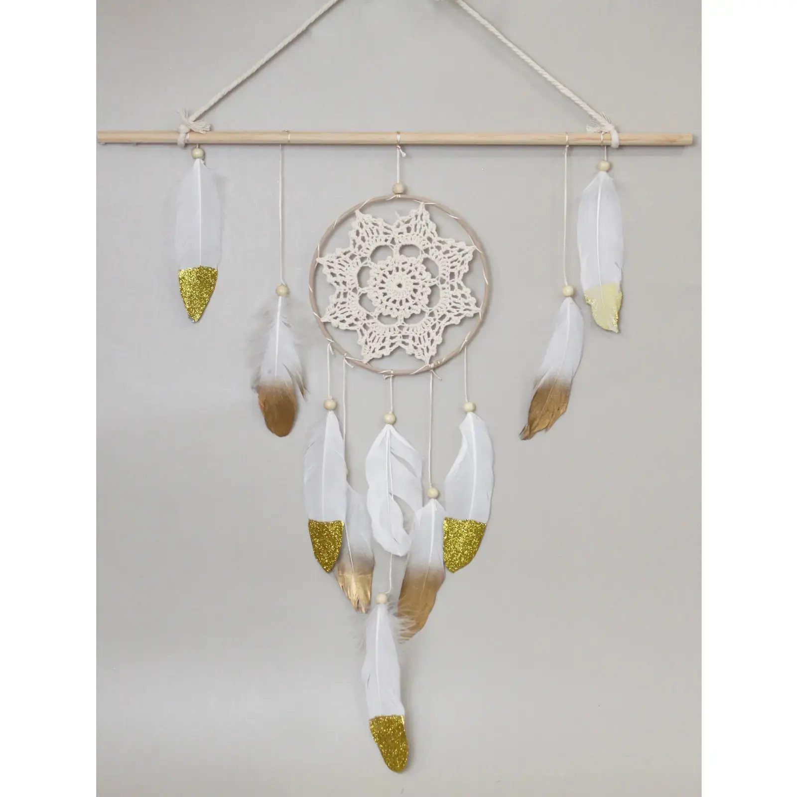 Ловец снов выполнен в светлых бежево-белых тонах с металлическим золотым акцентом. Центральная часть оформлена кружевным плетением в форме звезды. Подвешен на деревянную перекладину, из-под которой ниспадают нити с мягкими перьями — часть из них декорирована золотым глиттером, другие — золотой краской. Легкие деревянные бусины подчеркивают природную эстетику.