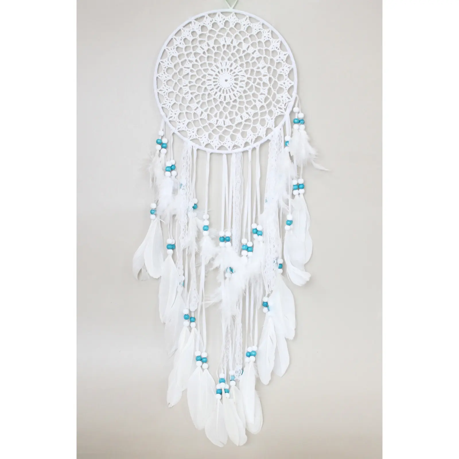 Размер изделия — 25 х 105 см. Основание ловца снов выполнено из прочных ПВХ и пластиковых элементов, дополненных текстильными нитями и кружевом. Перья закреплены на отдельных подвесках из лент и нитей, создавая мягкую динамику при движении воздуха. Цвет — гармоничный белый с акцентами голубого. Отгружается один товар, цвет элементов может варьироваться в зависимости от партии.