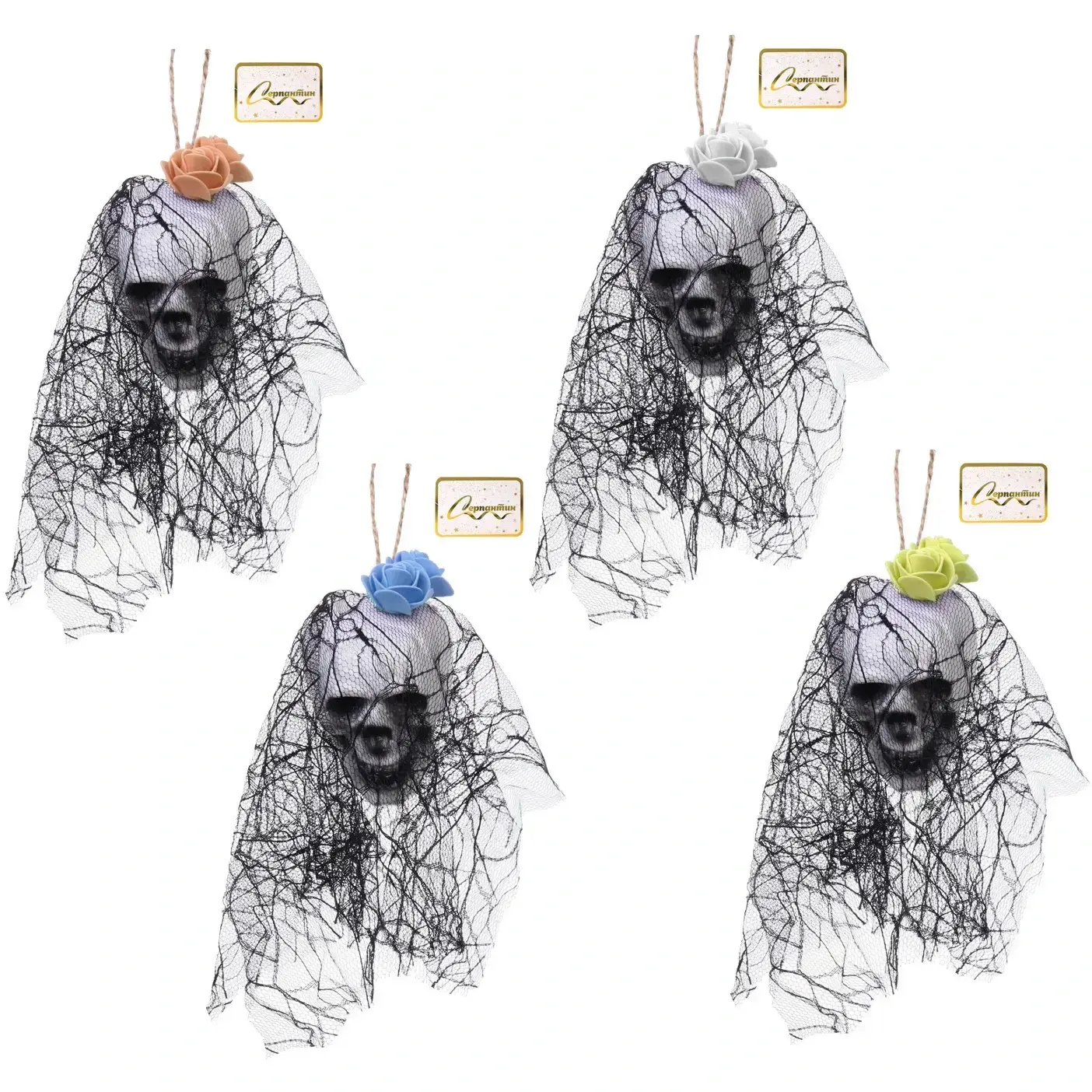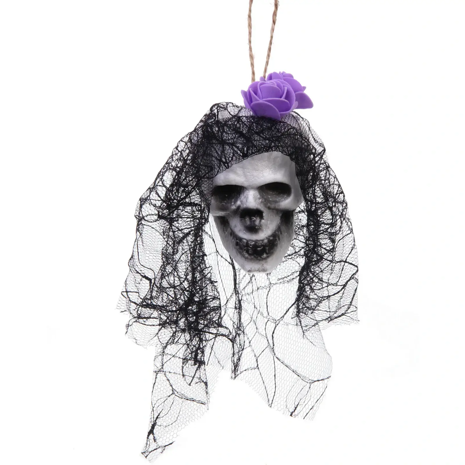 Декорация выполнена в виде реалистичного черепа, обвитого черной сеткой, что создает эффект паутины. На верхней части черепа расположена искусственная фиолетовая роза, добавляющая контраста и яркости. Подвесное крепление позволяет легко разместить украшение в любом месте — от потолка до стен. Это изделие подходит для использования как в помещении, так и на улице, что делает его универсальным элементом декора.