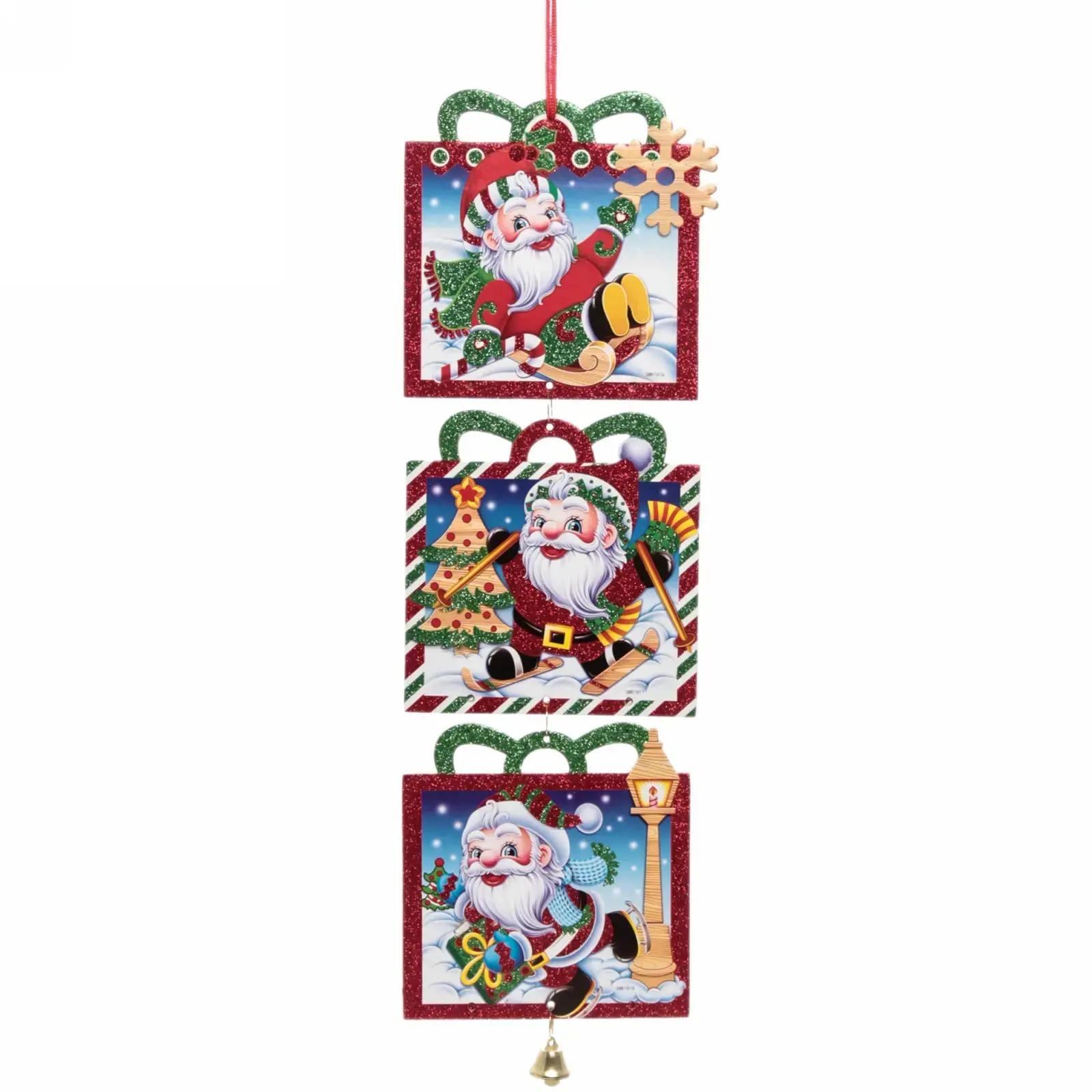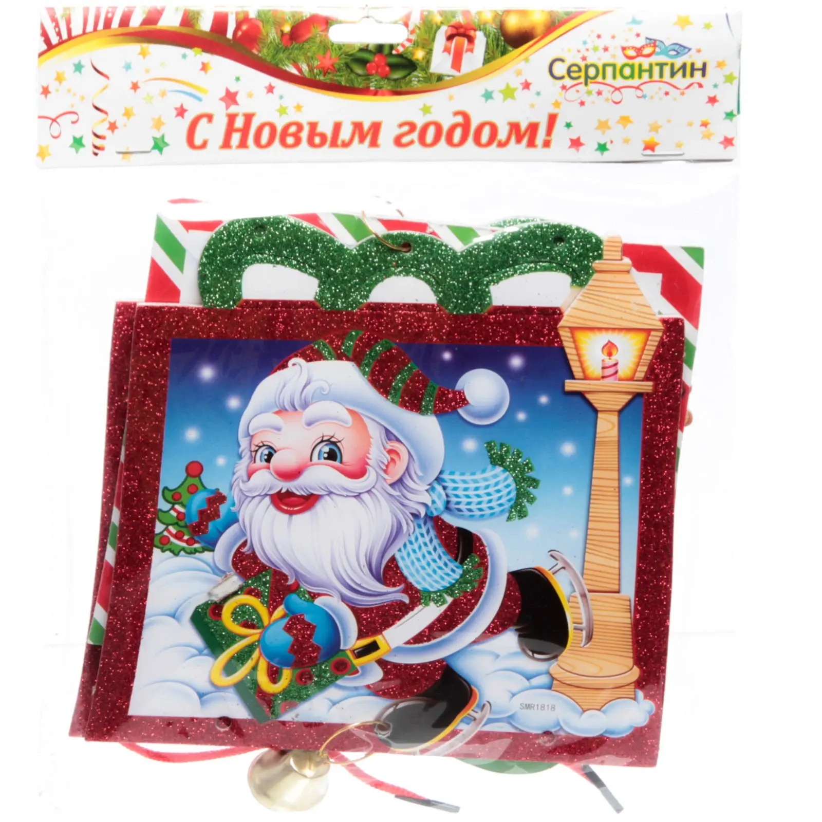 Изделие выполнено из высококачественного ПВХ с глиттерным покрытием, что обеспечивает яркий блеск и долгий срок службы. В комплект входит прочная красная лента для удобной подвешивания, а красочный дизайн с изображением Санта-Клауса и зимних элементов делает его универсальным для оформления любой новогодней локации.