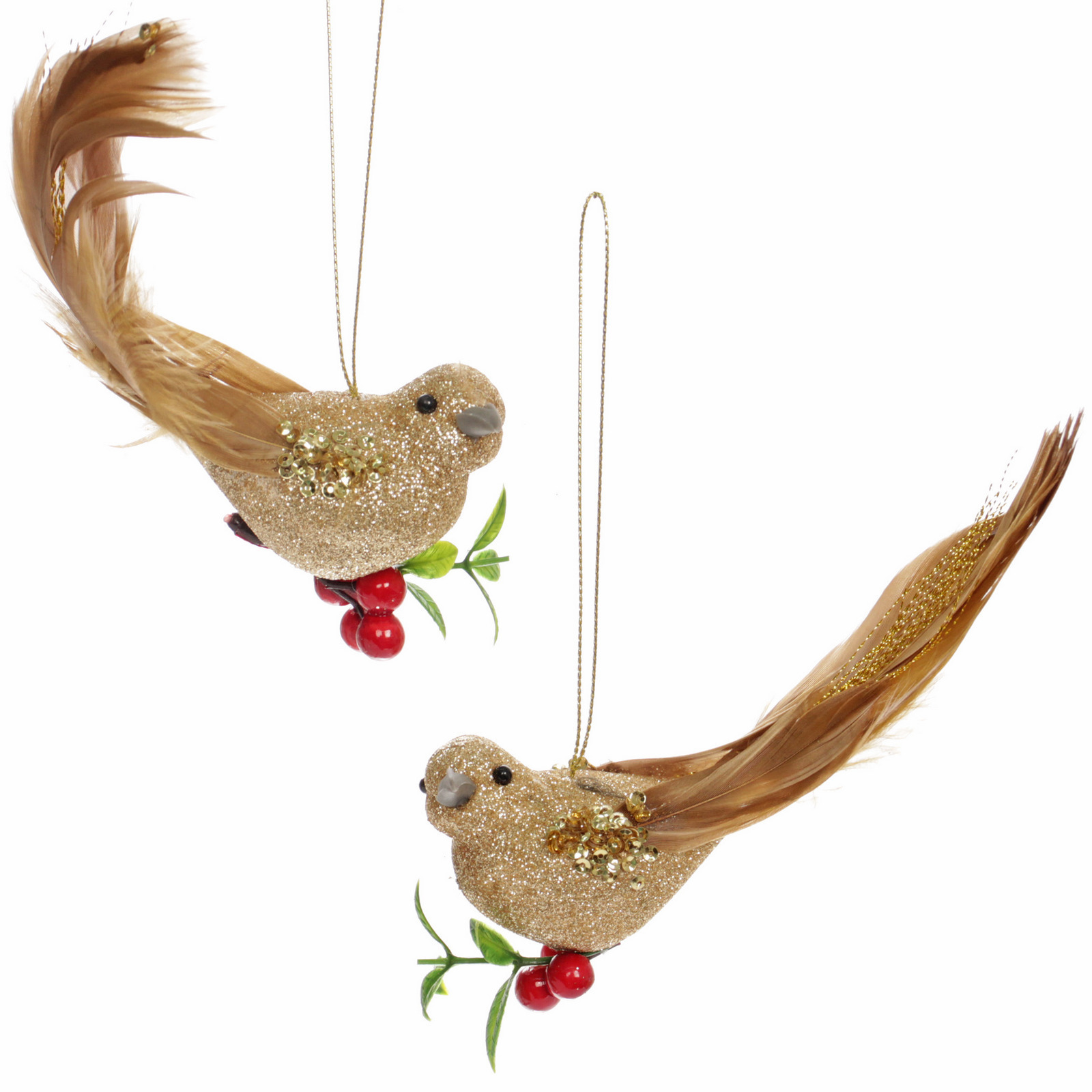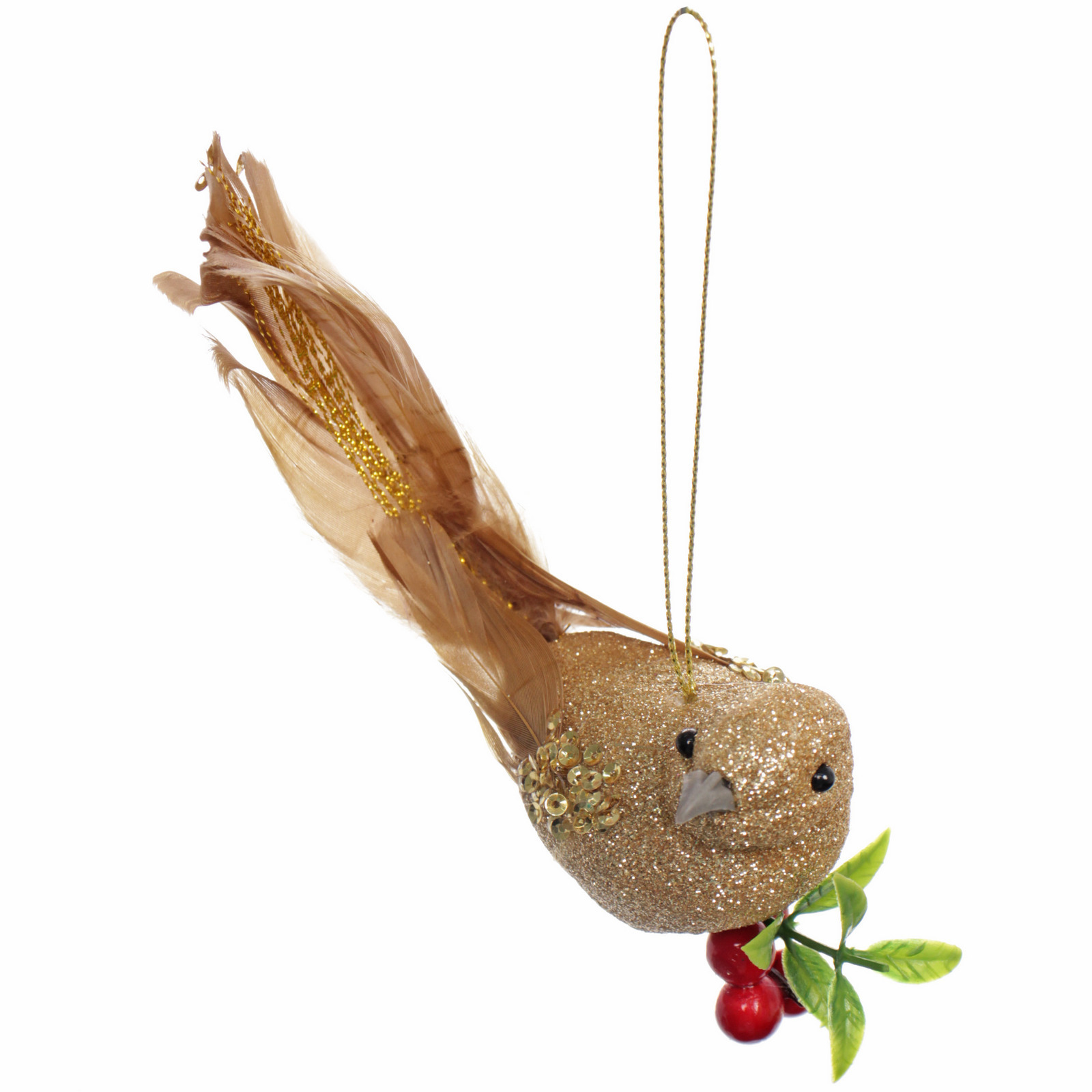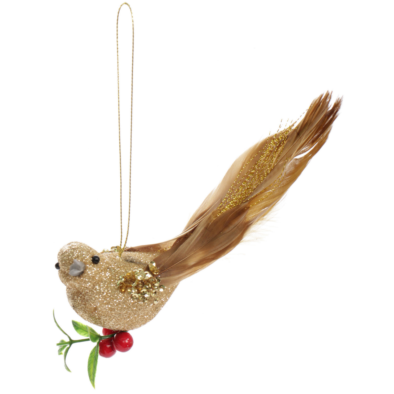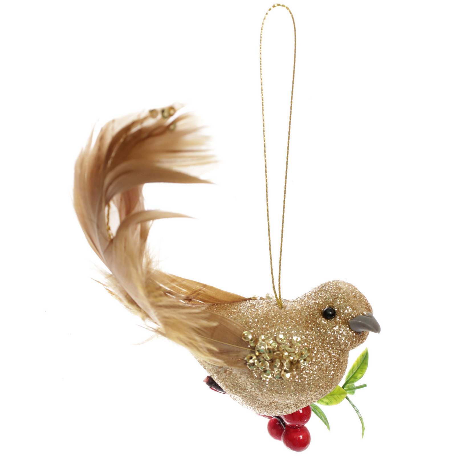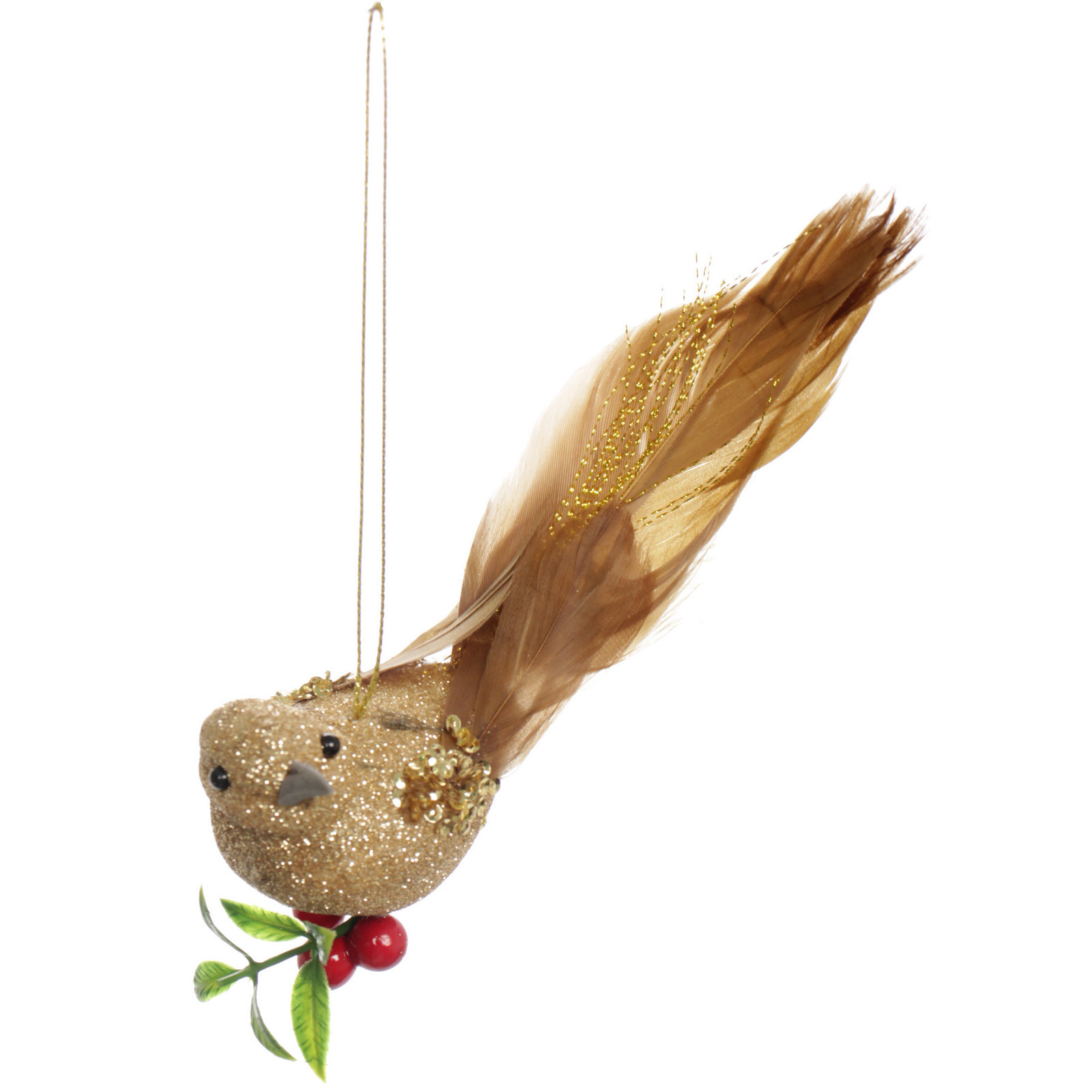 Подвесное украшение выполнено в виде птички с длинными хвостиками из перьев, что создает эффект легкости и динамичности. Каждое украшение имеет золотистую нить для подвешивания, что позволяет легко разместить его в любом месте: на елке, в окне или на стене. Это изделие идеально подходит для декорирования как жилых помещений, так и праздничных мероприятий.
