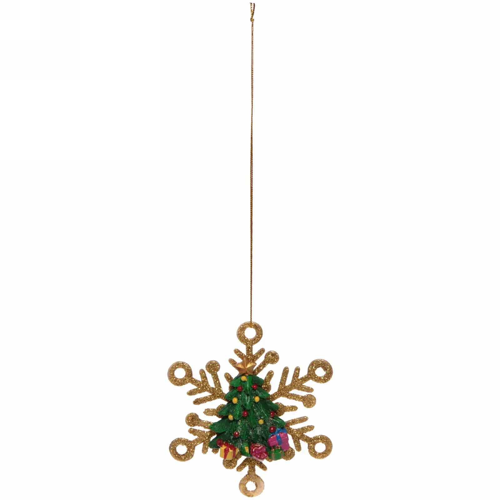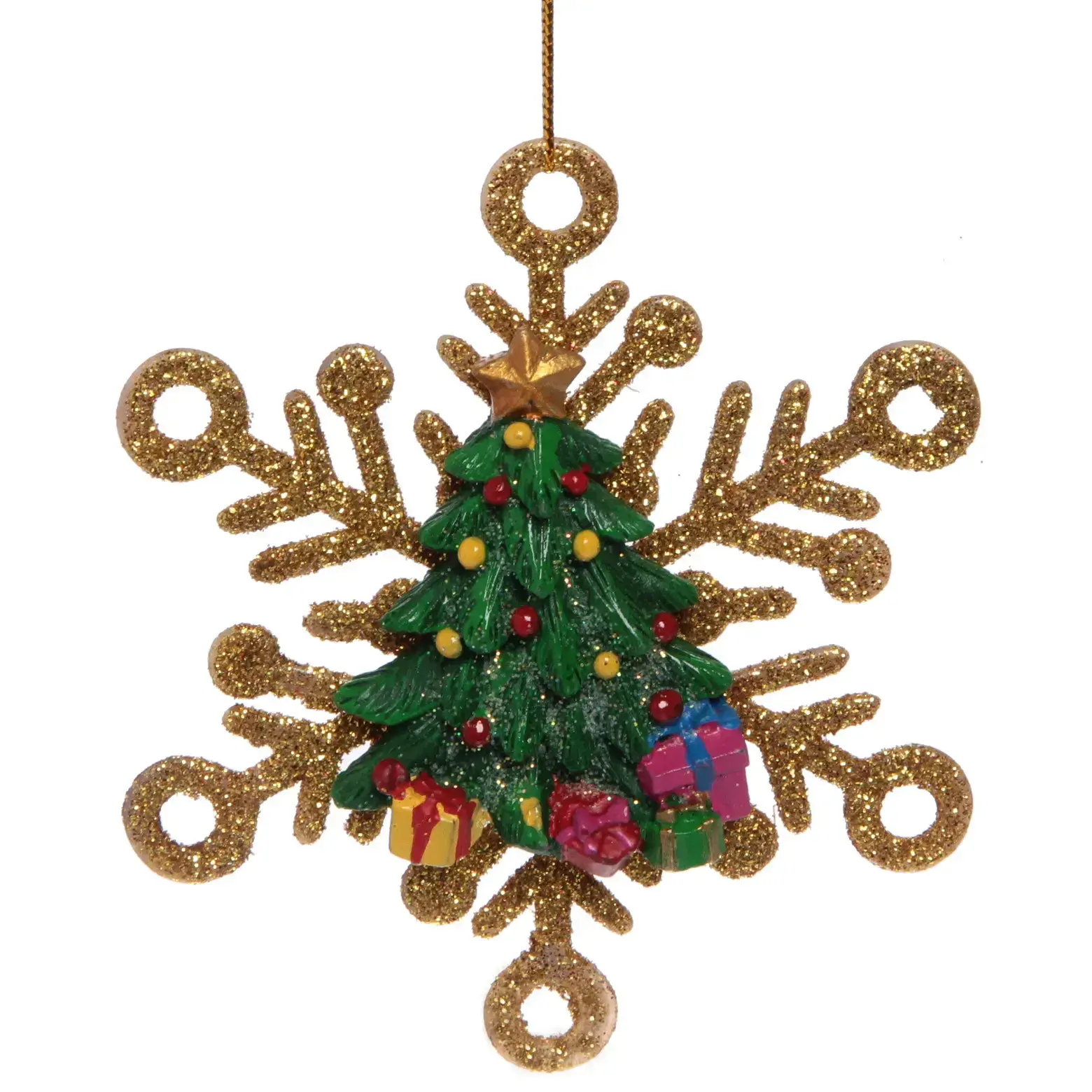 Почему стоит выбрать именно это украшение? Во-первых, его симметричная форма и золотистый блеск привлекают внимание и создают праздничное настроение. Во-вторых, центральный элемент в виде миниатюрной зеленой ёлки с разноцветными шариками и подарками добавляет яркие акценты, которые радуют глаз. Это украшение не только красиво, но и долговечно, что позволяет использовать его не один год.