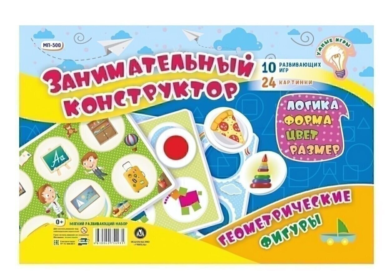 Игра "Занимательный конструктор" предлагает множество вариантов игр и заданий. Вы можете использовать карточки для изучения геометрических фигур, цветов и размеров, а также для развития логического мышления и воображения. В комплекте представлены задания на группировку предметов по форме, цвету и размеру, а также на развитие логического мышления и воображения.