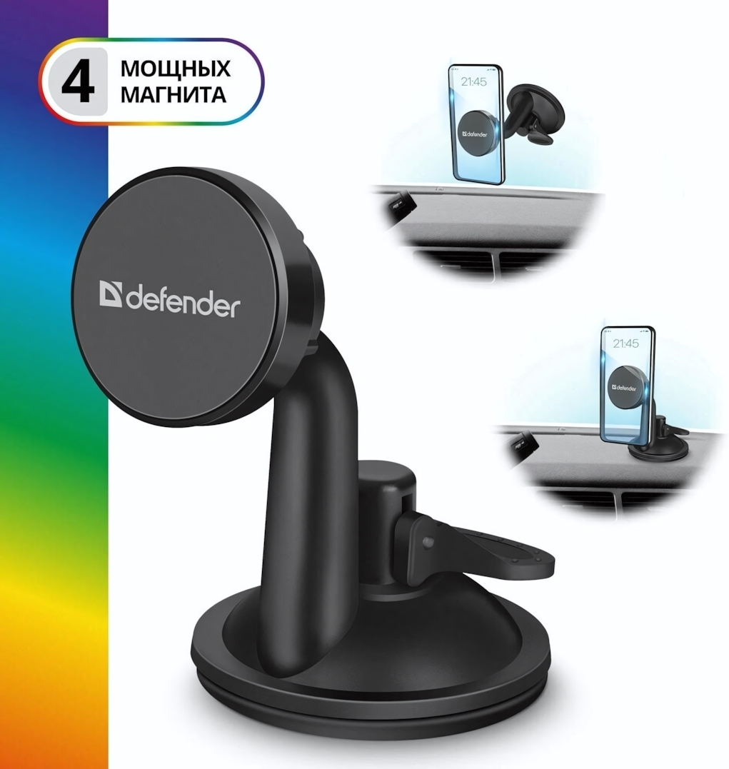 Магнитный держатель для телефона Defender 152+ на панель/стекло, 4 мощных магнита, черный
