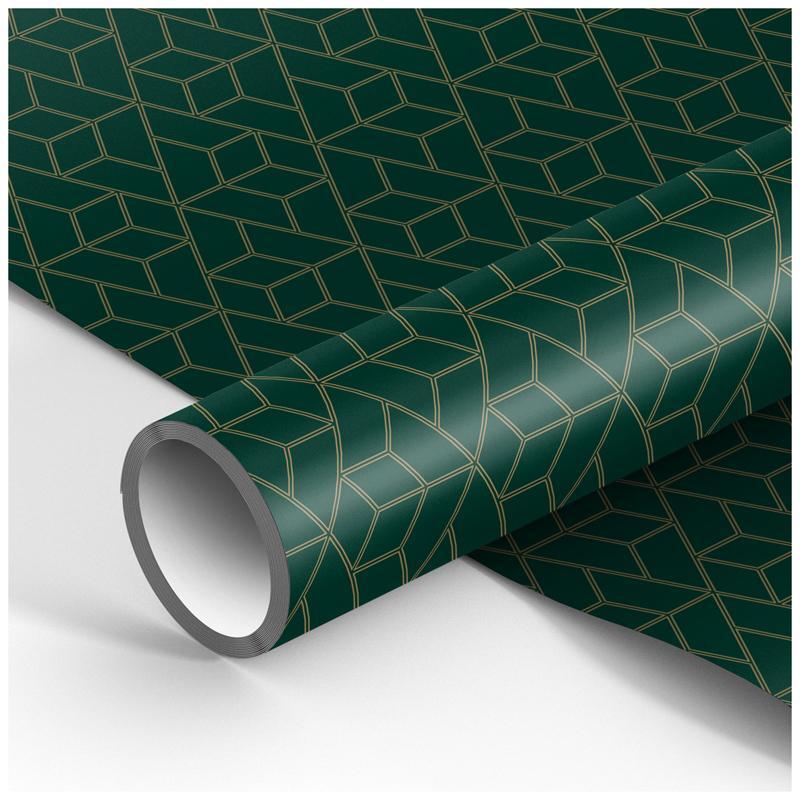 Бумага поставляется в удобном рулоне, защищенном термопленкой. Это гарантирует сохранность материала при транспортировке и хранении. Геометрический узор с трехмерным эффектом в темно-зеленых тонах с золотистым контуром создает современный и стильный дизайн.