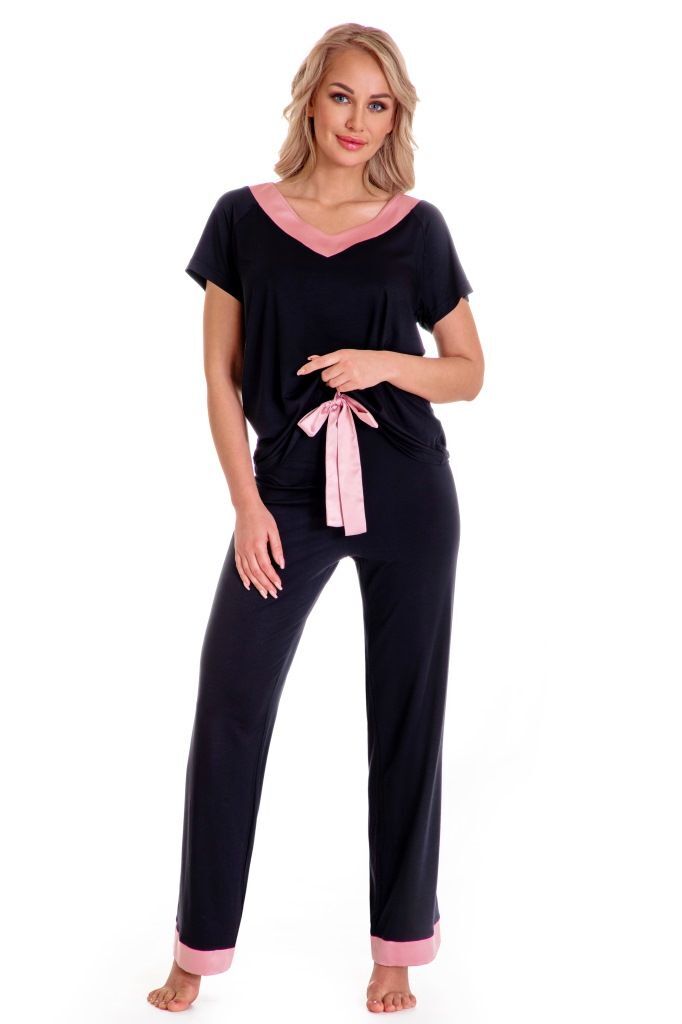 Пижама состоит из черного топа с коротким рукавом и брюков свободного кроя. V-образная горловина топа декорирована контрастной тканью цвета пудры, что добавляет изюминку в общий образ. Брюки имеют эластичную резинку и манжеты, а также милый бантик из ткани цвета пудры, что делает комплект стильным и практичным.