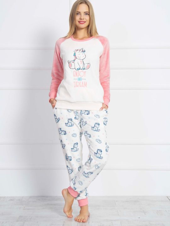 - Кофта: белого цвета с розовыми рукавами и манжетами. На груди расположена милая аппликация с изображением единорога и вдохновляющей надписью "ENJOY AND DREAM".