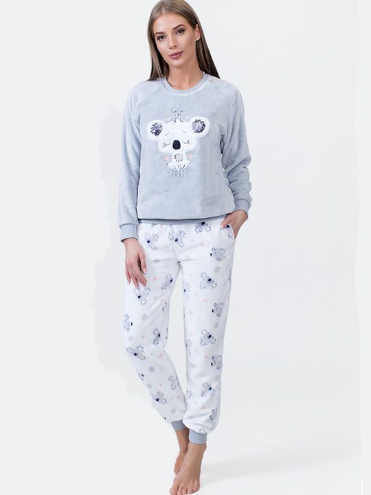 Пижама состоит из кофты с длинными рукавами и брюк прямого покроя. Оба предмета имеют манжеты — на запястьях и щиколотках, что помогает сохранять тепло и обеспечивает удобную посадку. Брюки оснащены карманами, куда можно положить телефон или другие мелочи, не вставая с дивана. Светло-серый цвет кофты гармонично сочетается с брюками светлого оттенка, создавая нежный и спокойный образ.