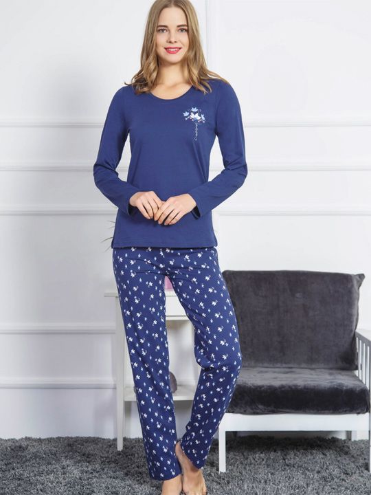 Футболка выполнена в однотонном темно-синем цвете с небольшим цветочным принтом на груди. Брюки прямого кроя украшены белым цветочным рисунком по всей поверхности, что добавляет комплекту изящества. Трикотажное полотно мягкое и эластичное, хорошо сохраняет форму после стирки.
