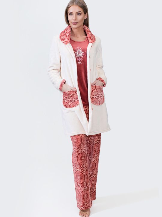 - Практичность и функциональность: халат с карманами позволяет хранить мелкие предметы под рукой, а классический покрой брюк и свитшота подходит для большинства типов фигур.