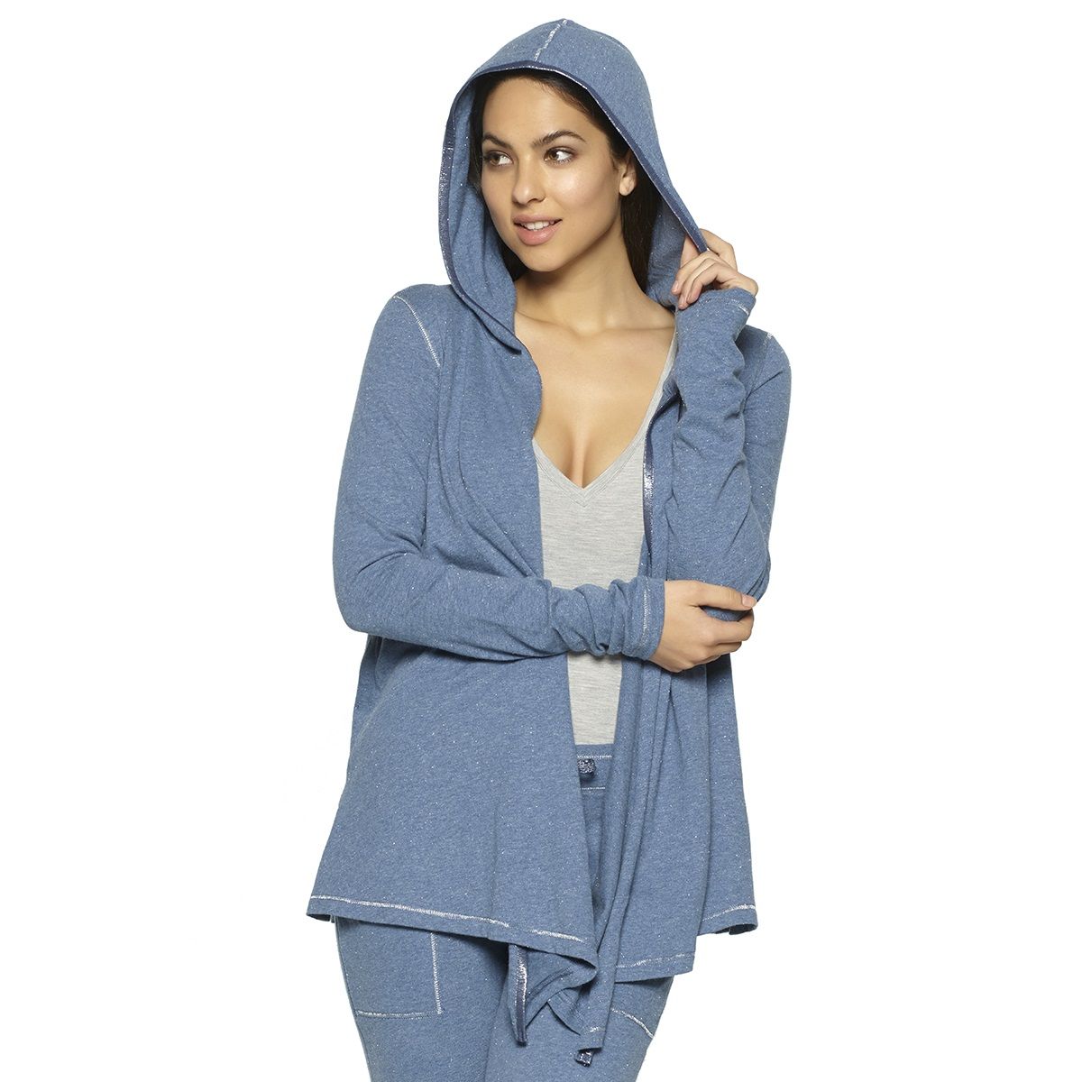 Модель выполнена с капюшоном и открытым асимметричным кроем: полы красиво драпируются спереди, создавая расслабленный силуэт. Удлиненные боковые линии и аккуратная декоративная строчка по краям подчеркивают форму изделия. Внутренние карманы, скрытые в боковых швах, позволяют держать под рукой необходимые мелочи, сохраняя аккуратный внешний вид.