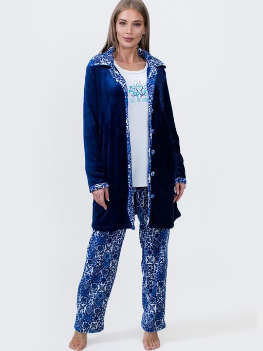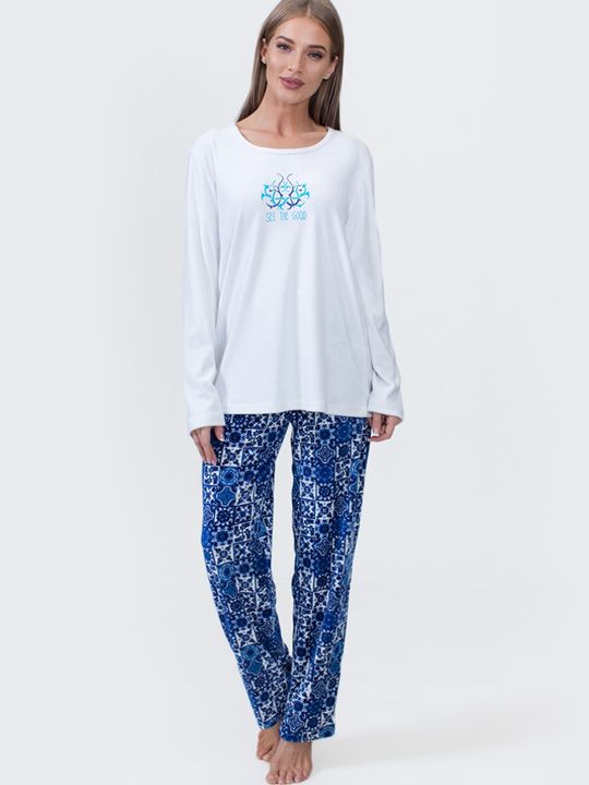 - Стильный внешний вид — сочетание тёмно-синего однотонного халата, белого свитшота с принтом и орнаментных брюк создаёт гармоничный образ.