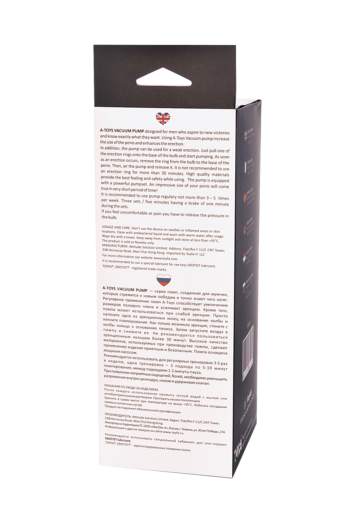 Помпа A-Toys оснащена мощным насосом, который обеспечивает быстрое и эффективное создание вакуума. Общая длина изделия составляет 27,5 см, а максимальный диаметр основания — 7,1 см. Это позволяет легко использовать помпу и контролировать процесс благодаря градуировке на прозрачной части. Рекомендуем использовать смазку на водной основе для максимального комфорта и очищающий спрей Clear Toy 100 мл для обработки изделия после использования.