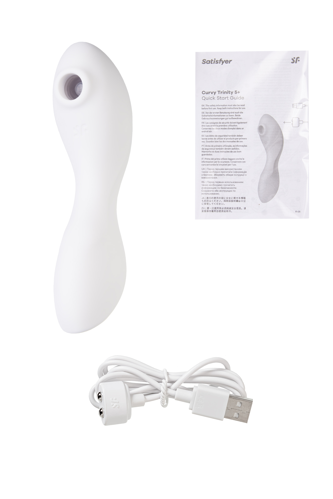 \nПогрузитесь в тройное удовольствие с Curvy Trinity 5+ – вакуумно-волновым стимулятором 3 в 1: воздушная стимуляция клитора, внешняя стимуляция эрогенных зон и внутренний массаж G-spot через вибрацию. Устройство выполнено в белом цвете и удобно управляется тремя кнопками на корпусе; два независимых мотора позволяют сочетать режимы под настроение.