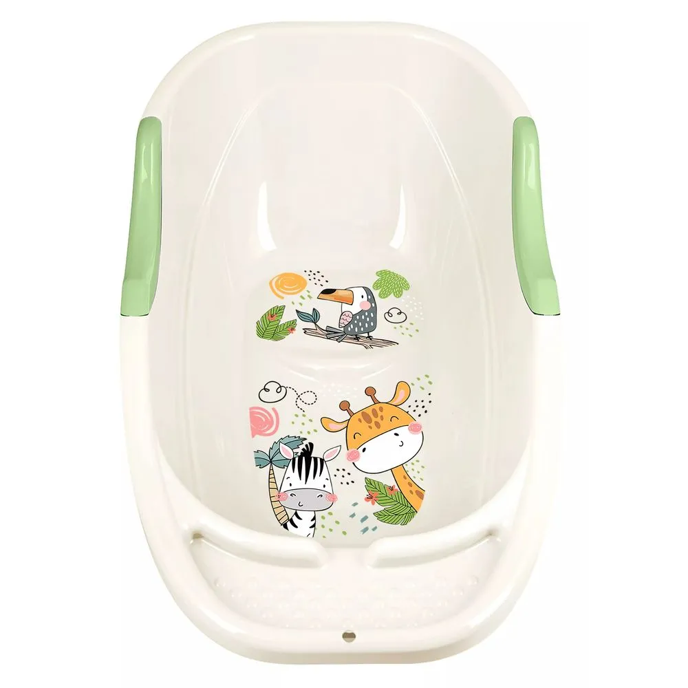 - Яркий развивающий элемент: Красочный рисунок на внутренней поверхности с изображением дружелюбного жирафа, зебры и тропических птиц привлекает внимание малыша и превращает купание в увлекательную игру.