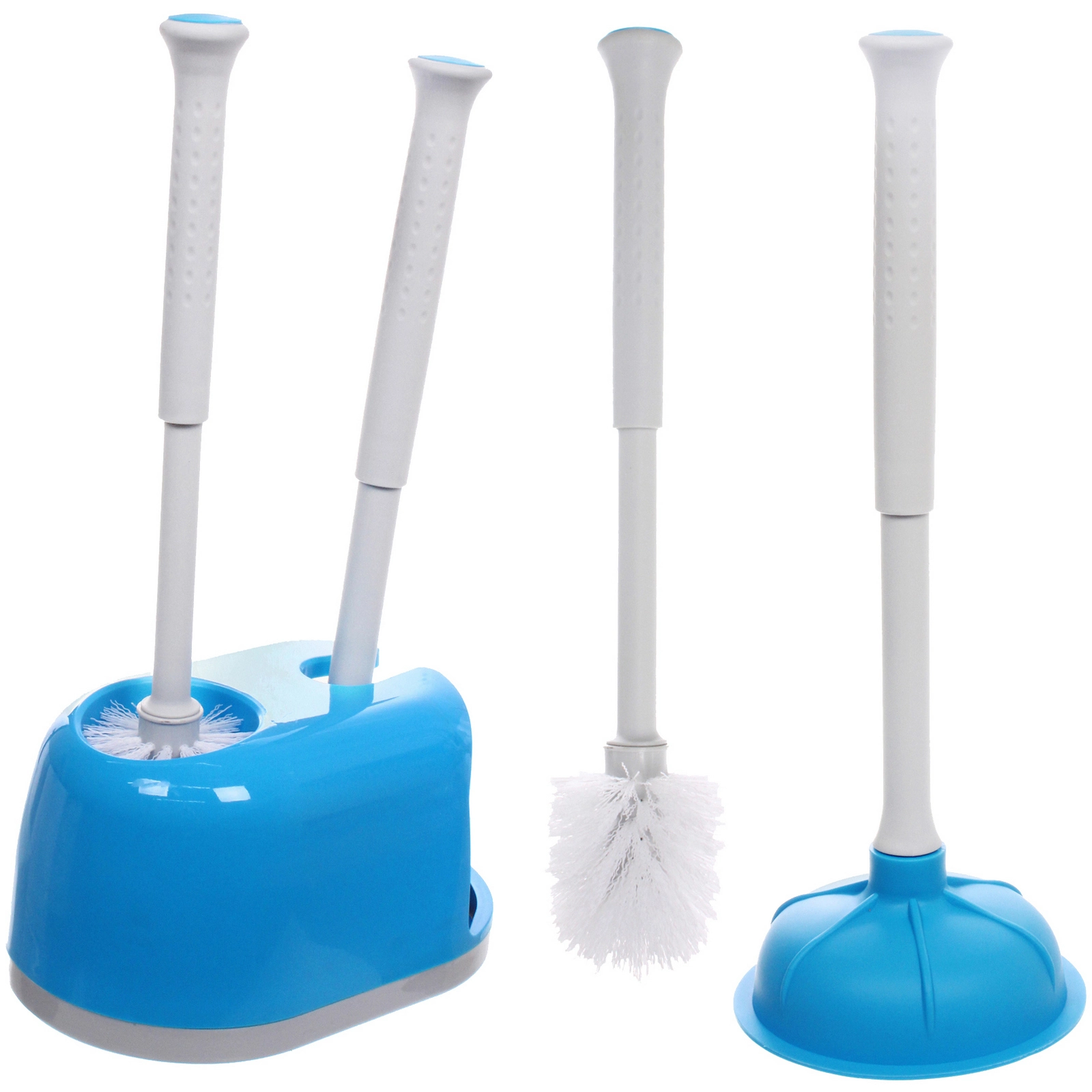 В комплект входит вантуз, ершик и общая подставка с двумя отсеками. Передний открытый отсек предназначен для вантуза, задний — для ершика. Такая конструкция обеспечивает аккуратное хранение и быстрый доступ к каждому предмету. Набор подходит для квартиры, частного дома, офиса или дачи.