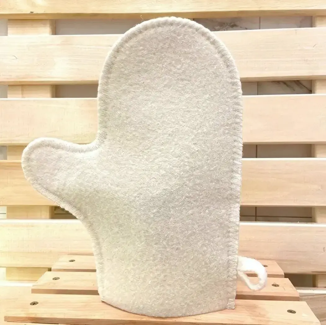 Наденьте варежку на руку перед работой с печью или горячими камнями. Для массажа: смочите в тёплой воде, аккуратно растирайте кожу круговыми движениями. После 3-5 применений естественный пилинг удалит ороговевшие частицы.