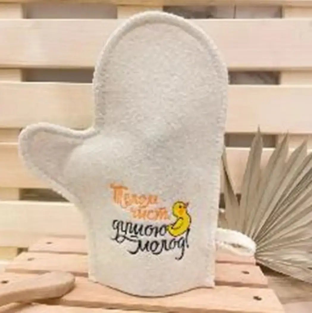 Банная варежка с вышивкой «Телом чист, душою молод», шерсть/полиэстер, цвет белый