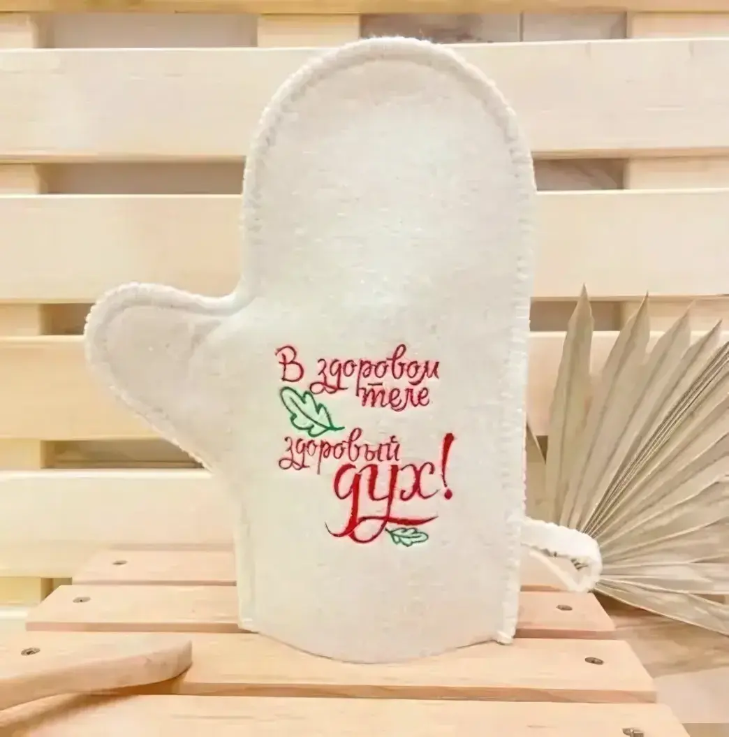 Банная варежка 'В здоровом теле, здоровый дух' - ваш надежный помощник для безопасного парения. Благодаря специальной текстуре материала, она не только защищает руки от ожогов, но и служит отличным массажным инструментом.