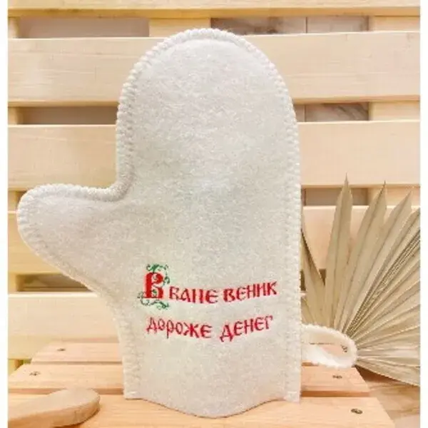 Варежка банная 'В бане веник дороже денег', войлок, белая с красной вышивкой