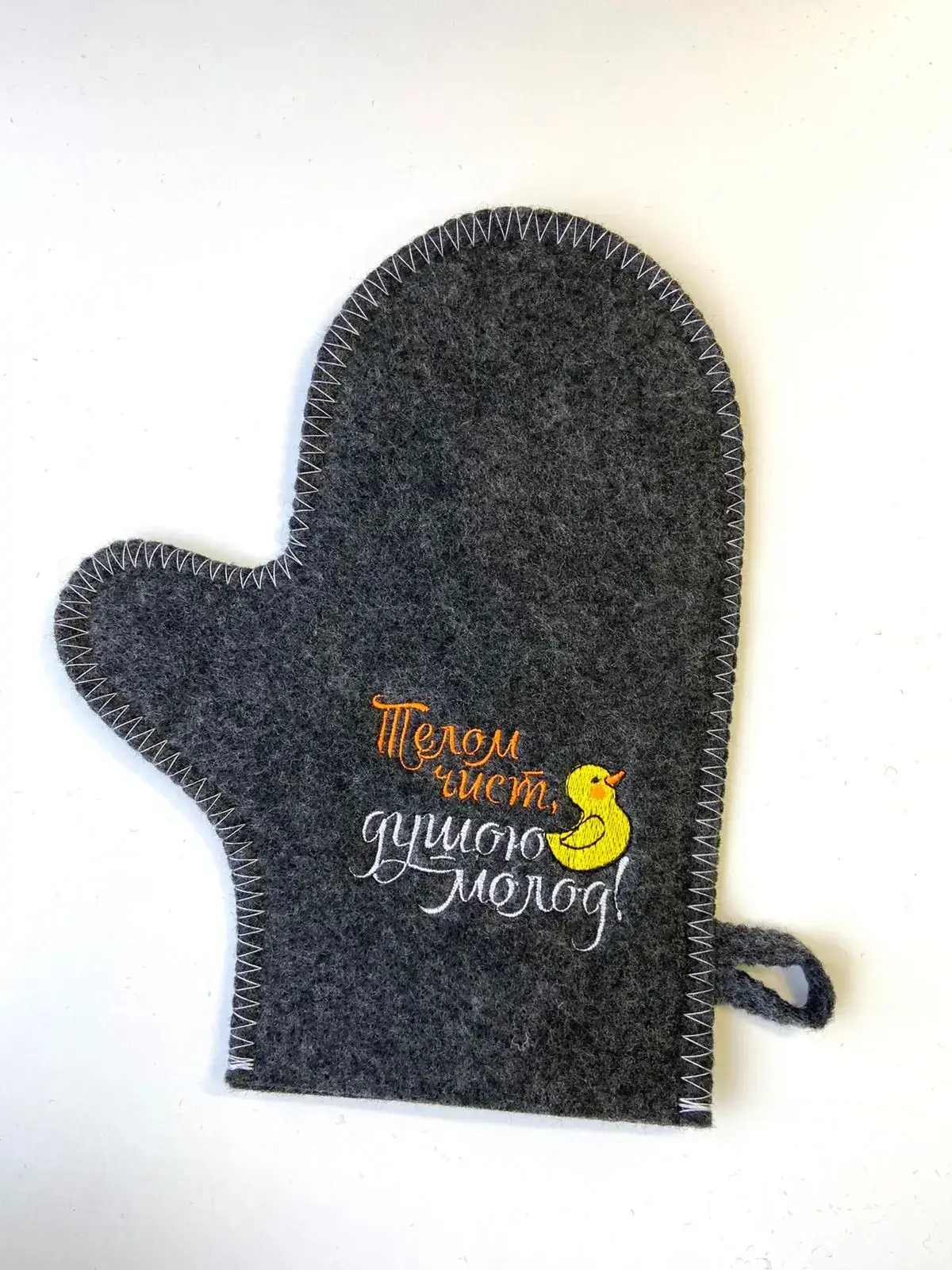 Варежка банная с вышивкой «Телом чист, душою молод», войлок серый, петля для подвешивания