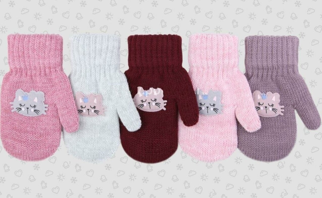 Размер варежек — р.13, что оптимально подходит для детей дошкольного возраста. Выполнены из мягкого трикотажа с эластичными манжетами. На лицевой стороне варежек размещен декоративный элемент в виде мордочки кота с закрытыми глазами и улыбкой.