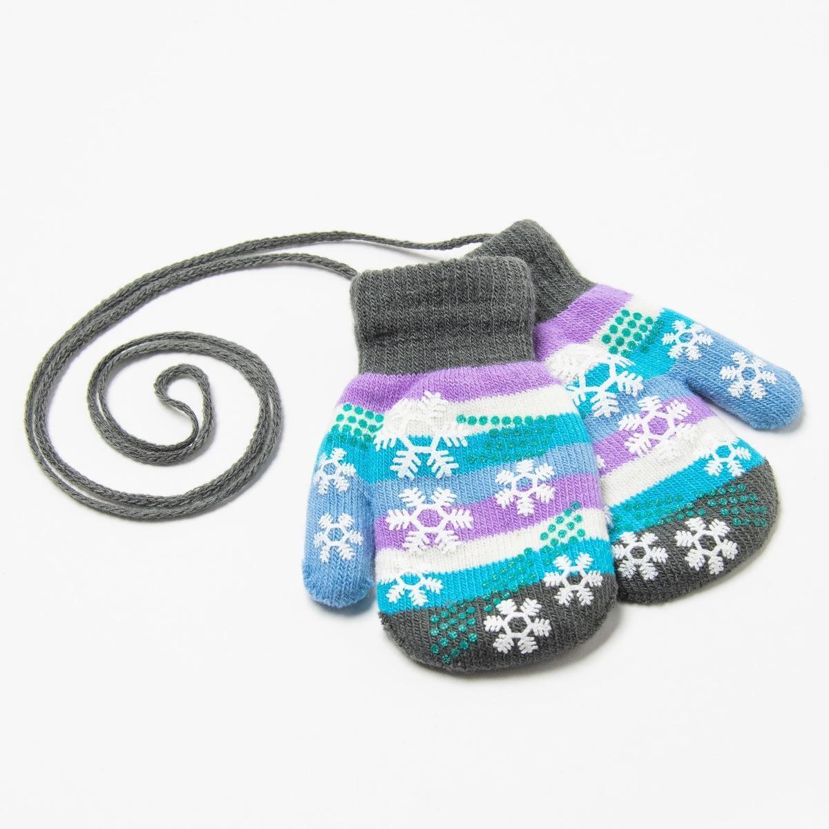 Размер: r.14,5 (подходит для детей 3‑5 лет). Материал: акрил 85 % + спандекс 15 %. Цвет: серый с яркими полосами (фиолетовый, голубой, белый, зелёный). Дизайн: закруглённый конец, эмбеддедные снежинки, шнурок для ношения на шее.
