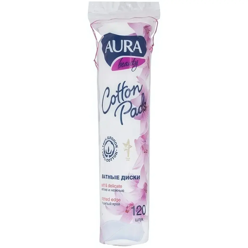 Каждый ватный диск AURA выполнен из качественного хлопка, что гарантирует его безопасность и эффективность. Упаковка содержит 120 штук, что делает их идеальным выбором для ежедневного использования. Основной цвет упаковки — белый с элементами розового и синего, что придаёт ей стильный вид. На упаковке также указано, что диски мягкие и деликатные, что подтверждает их высокое качество.