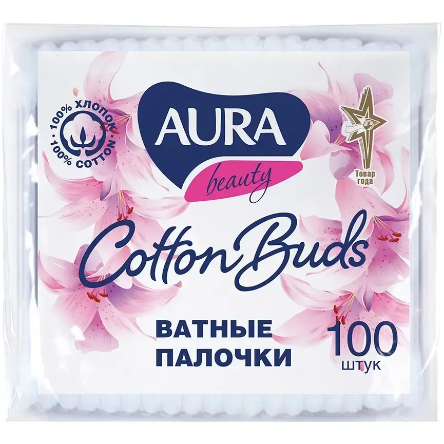 Ватные палочки 'AURA Beauty', 100 шт, 100% хлопок, пластиковый держатель