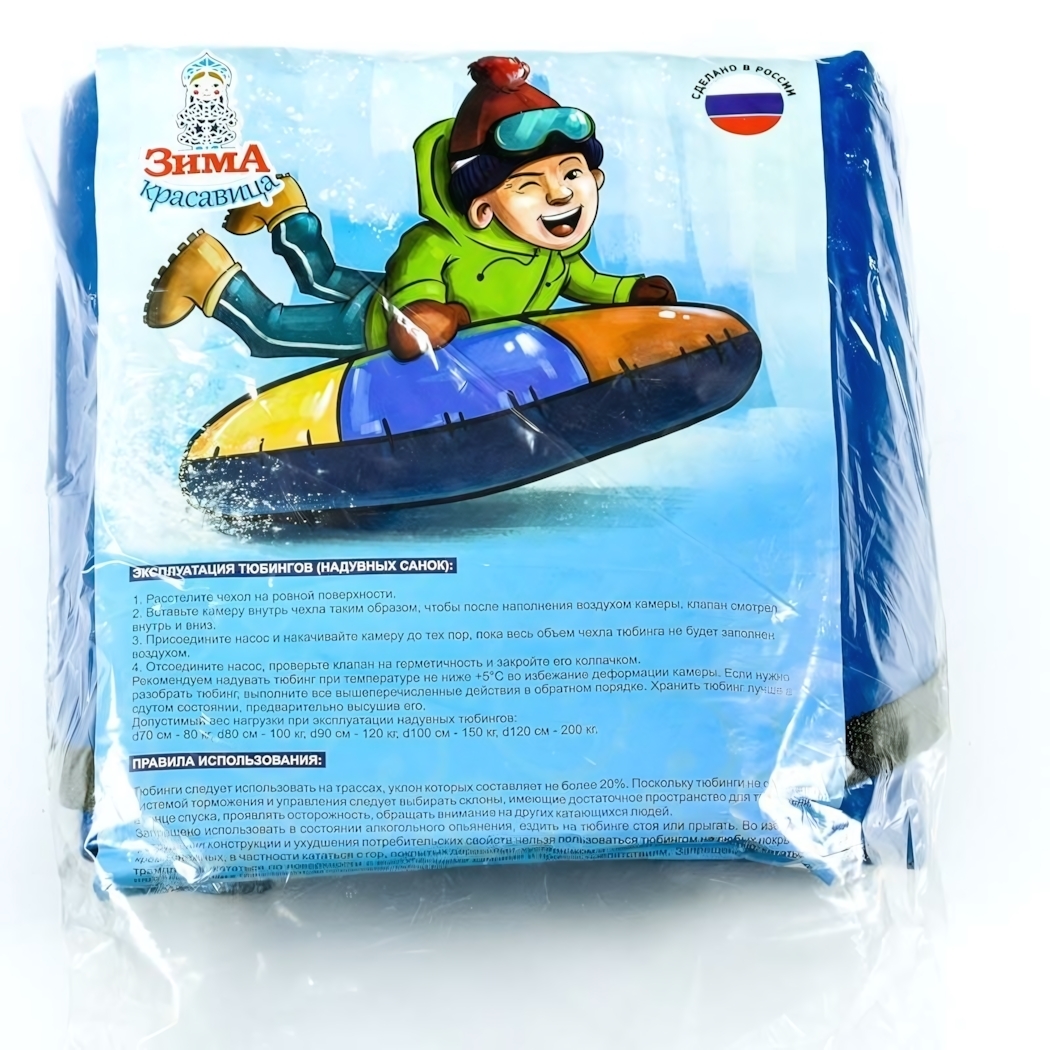 Размер ватрушки составляет 70 см в диаметре. Снаружи представлен прочный чехол, а для доступа к внутренней камере предусмотрена молния. Важно отметить, что цвет тюбинга может варьироваться, так как он доступен в ассортименте. Купите ватрушку "Зима красавица" и наслаждайтесь зимними развлечениями на свежем воздухе!