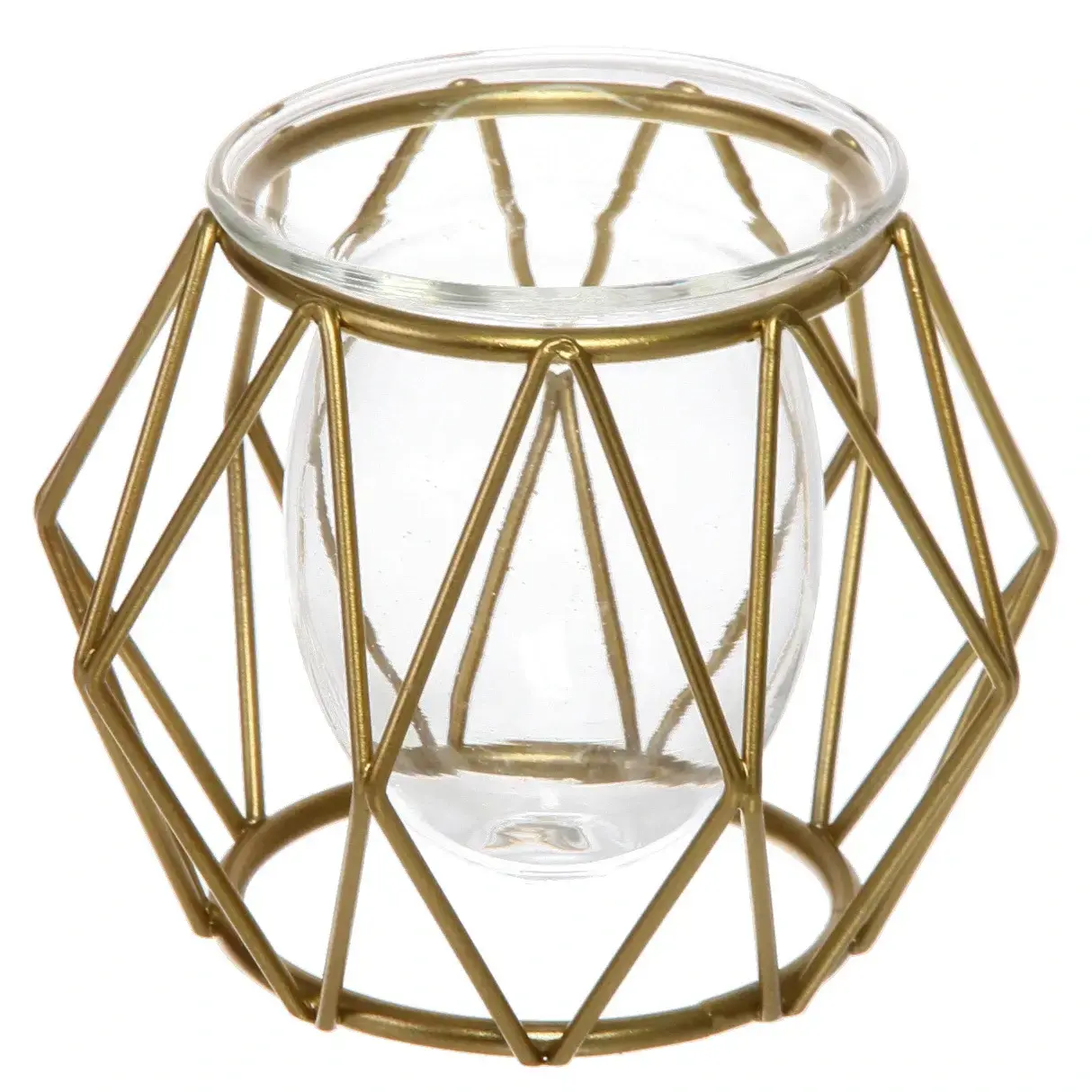 Металлический каркас выполнен из прочных прутьев, образующих геометрическую сетку, что придаёт изделию устойчивость и уникальный вид. Внутренний стеклянный контейнер имеет округлую форму и обеспечивает удобную установку цветов. Ваза станет отличным подарком для ценителей стильного декора и гармонии в деталях.