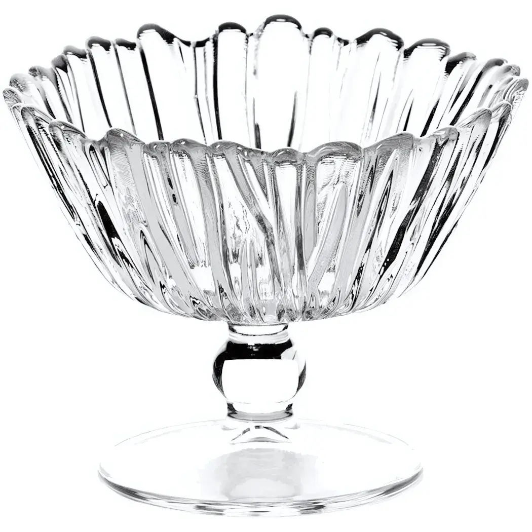 Ваза имеет округлую форму с волнистым краем и стоит на устойчивом круглом основании. Её размеры (высота 14 см) делают её универсальной для различных целей. Прозрачный цвет позволяет легко сочетать вазу с другими предметами сервировки, создавая гармоничный и стильный стол.