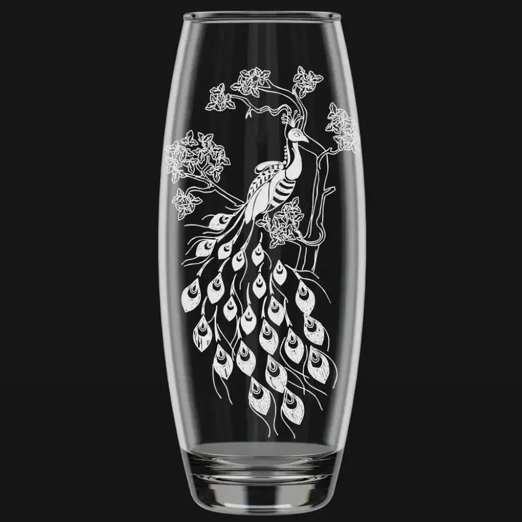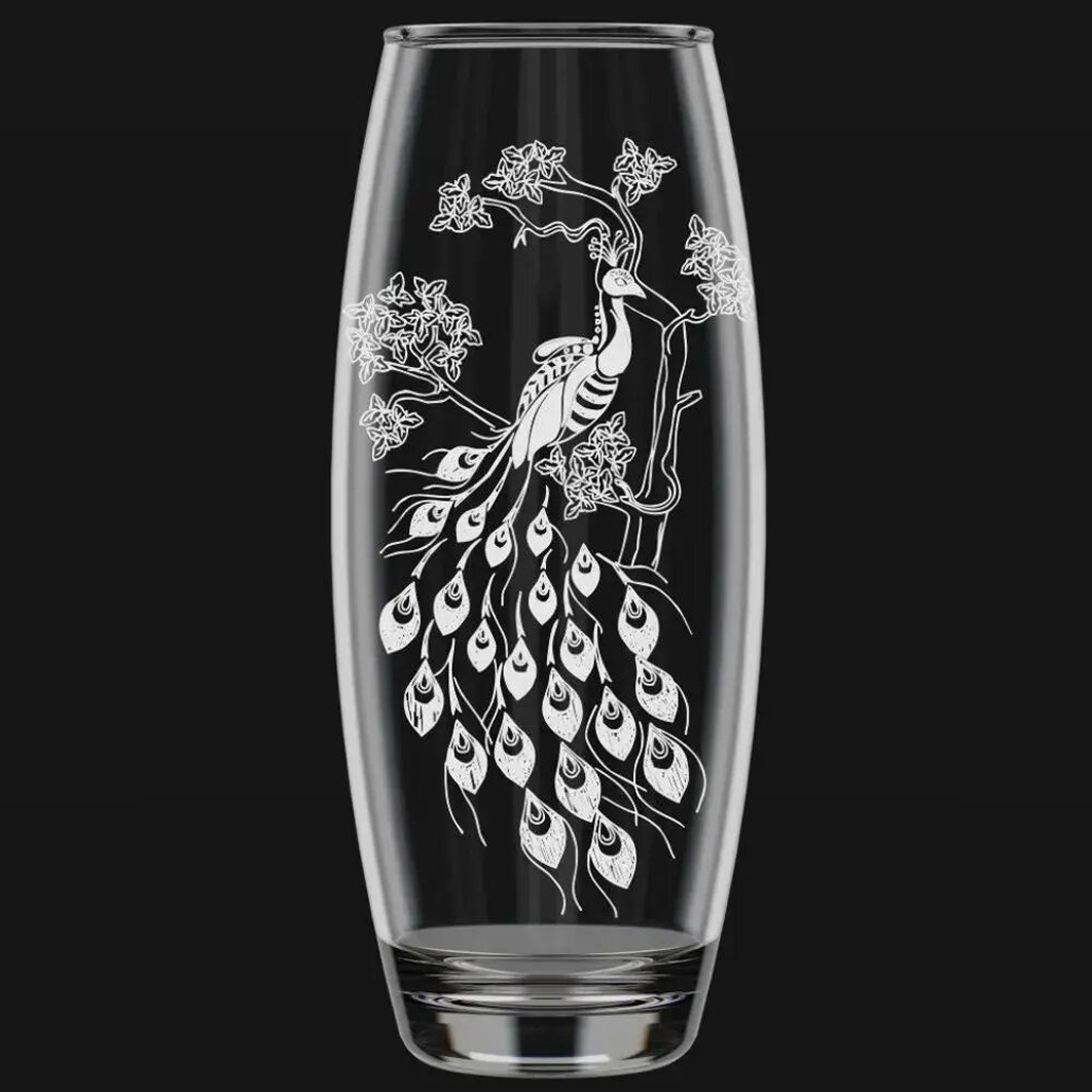 Стеклянная ваза «Павлин» сочетает функциональность и изысканный дизайн, создавая атмосферу утонченности в вашем доме. Сложный орнамент с изображением птицы и растительными мотивами превращает обычную емкость для цветов в самостоятельный арт-объект.
