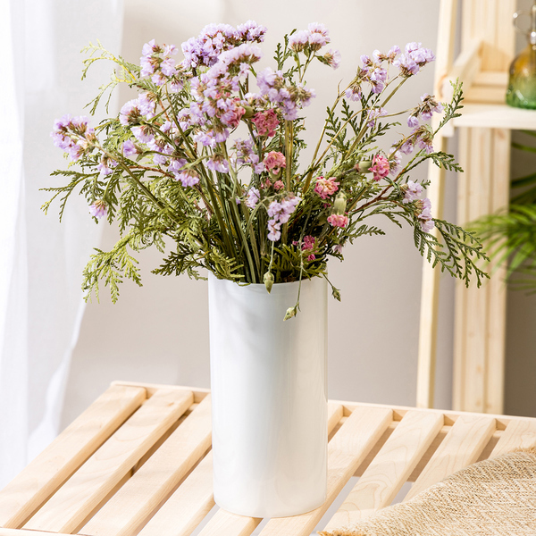 Ваза имеет классическую цилиндрическую форму и подходит для различных видов цветов и букетов. Её минималистичный дизайн позволяет легко вписать её в любой интерьер, будь то современный или классический стиль. Используйте её для создания красивых цветочных композиций на столе, подоконнике или в любом другом месте вашего дома.