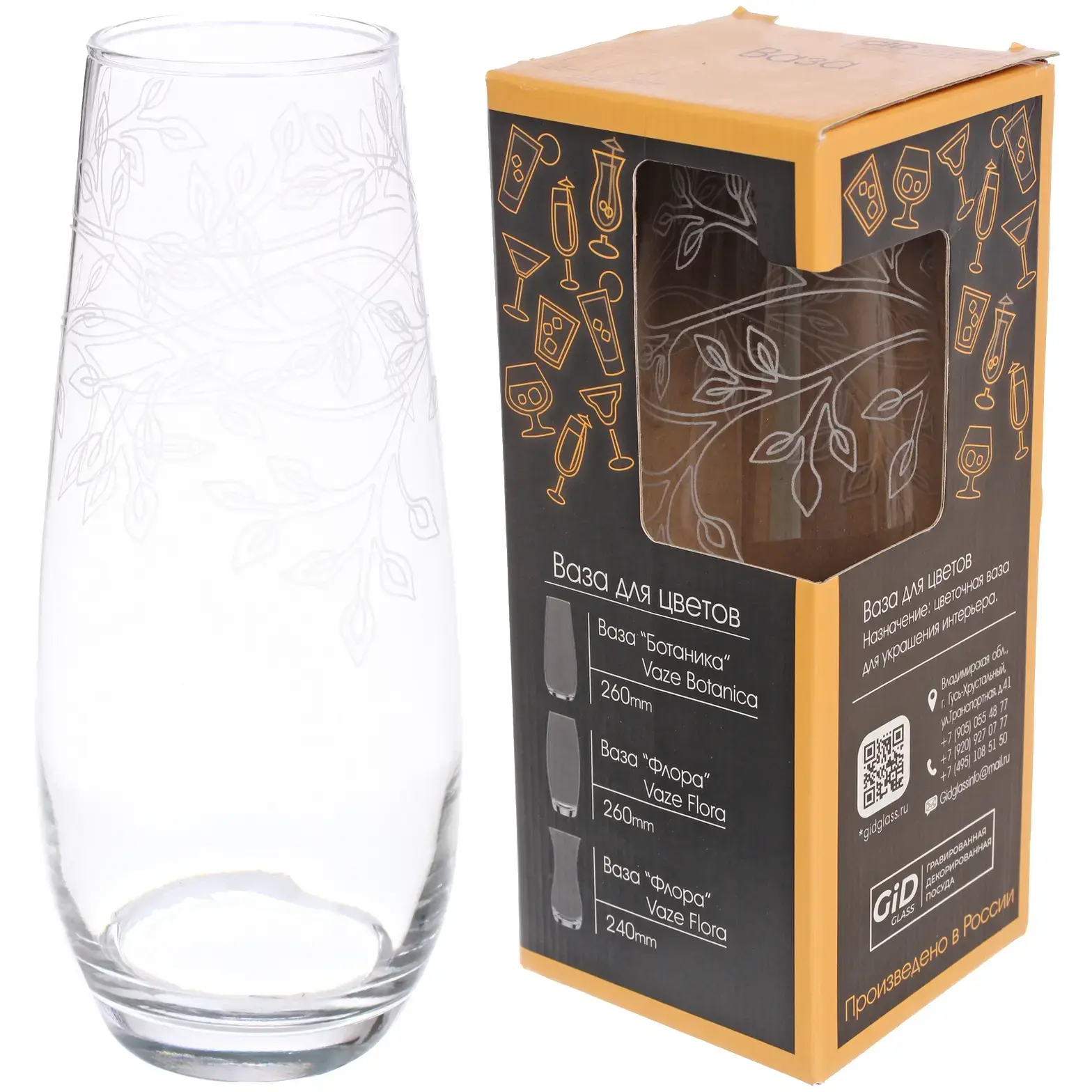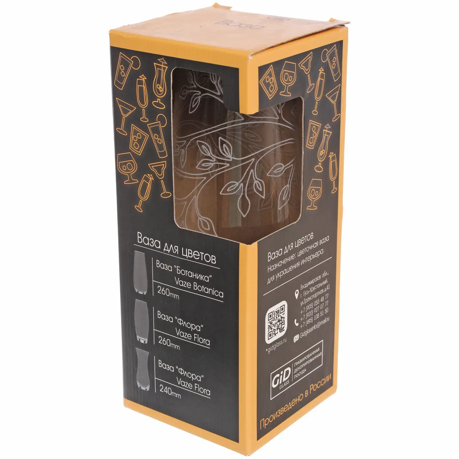Высота вазы составляет 260 мм, что делает ее идеальной для различных видов цветов. Прозрачный цвет позволяет акцентировать внимание на букете, а гравировка добавляет изысканности. Упаковка вазы выполнена в стильном дизайне, что делает ее отличным подарком для близких и друзей.