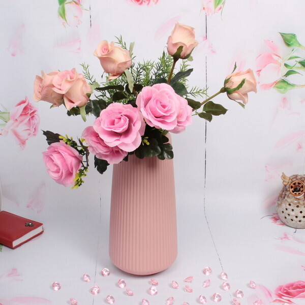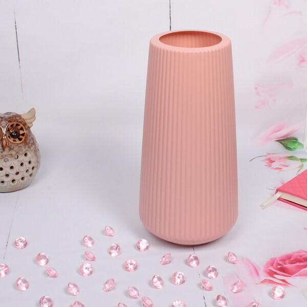 Ваза выполнена из качественного пластика, что гарантирует её долговечность и практичность. Нежно-розовый цвет и рифлёная текстура придают ей стильный вид, который отлично впишется в любой интерьер. Размеры вазы 30,5 см в высоту и 15,5 см в ширину делают её подходящей для различных цветочных композиций.