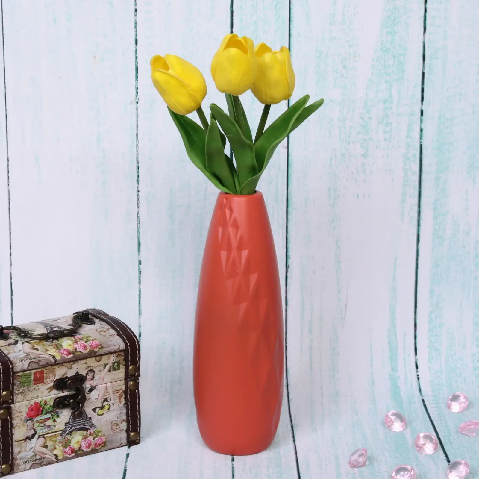 Благодаря прочному и гладкому пластику ваза устойчива к влаге и легко очищается от пыли. Её форма — вытянутая с плавным сужением к верхней части — позволяет цветам располагаться естественно и красиво. Поставляется поштучно, цвет — коралловый.