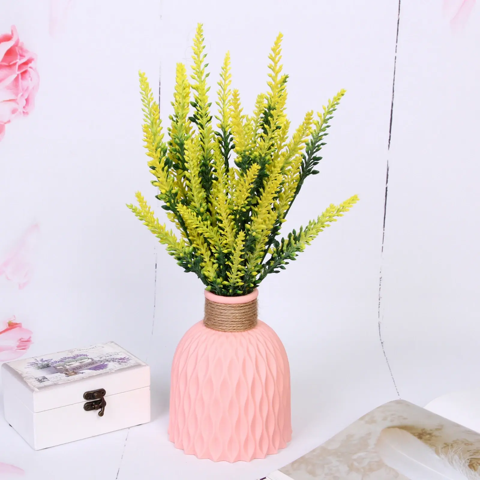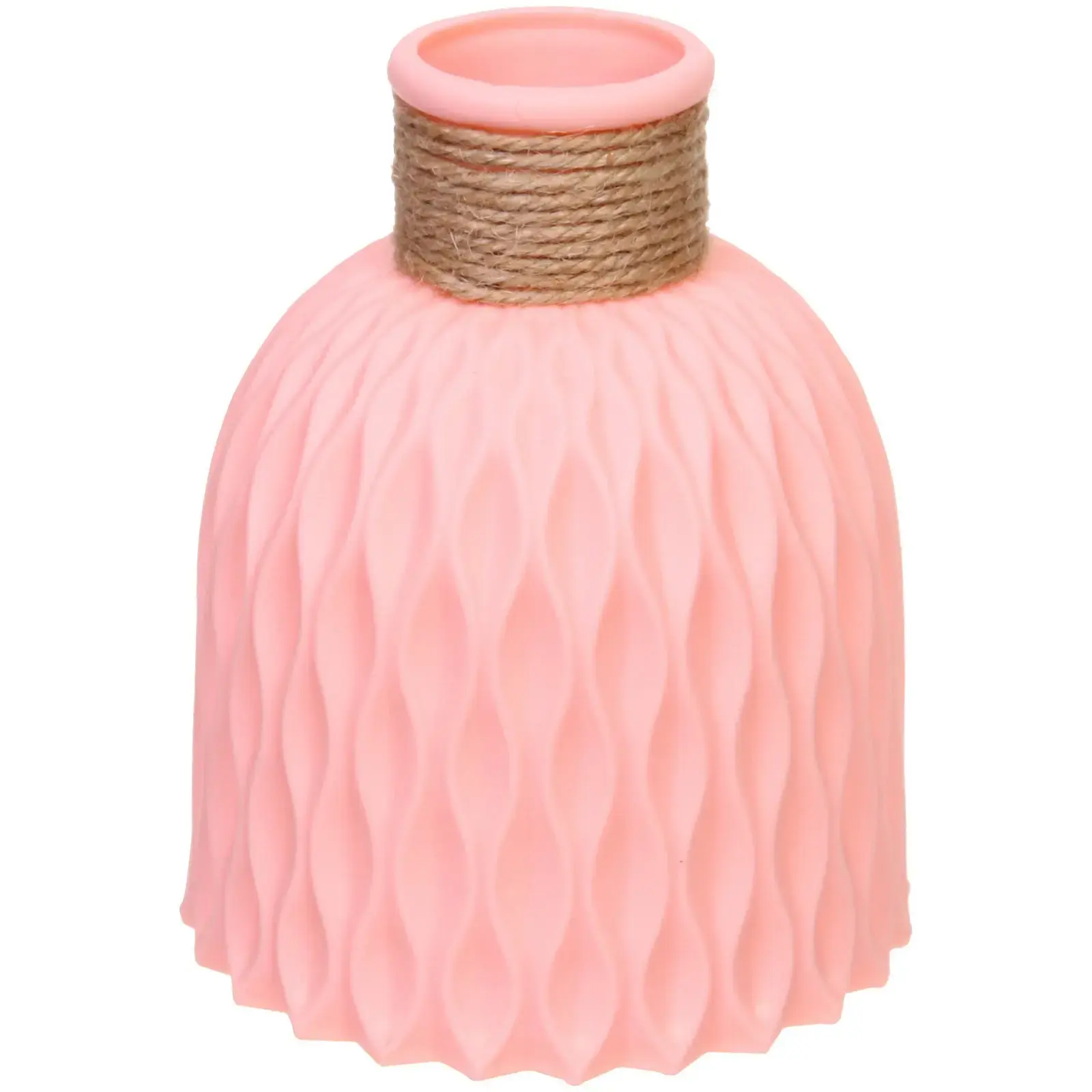 Детали: материал — пластик, украшение — верёвка из текстиля, размер — 12 см в ширину и 15 см в высоту. Цвет — розовый, подходит для большинства цветовых схем. Надёжное изготовление и современный дизайн делают эту вазу отличным выбором для украшения любой комнаты.