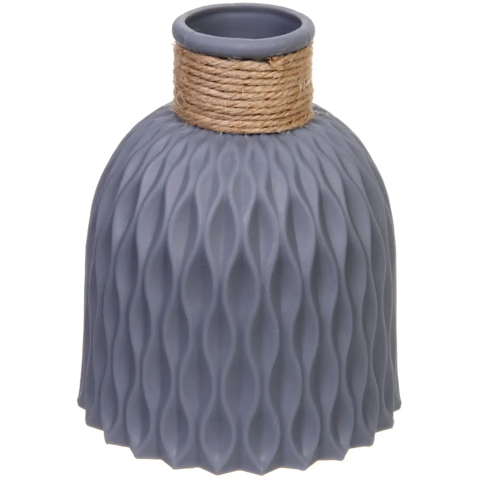 Размеры изделия — 12x15 см. Материал — качественный пластик с матовой поверхностью, имитирующей керамику. Декорировано натуральной бечёвкой светло-коричневого цвета. Цвет в ассортименте не предусмотрен, товар представлен в постоянном сером оттенке, что упрощает подбор к остальным предметам интерьера.